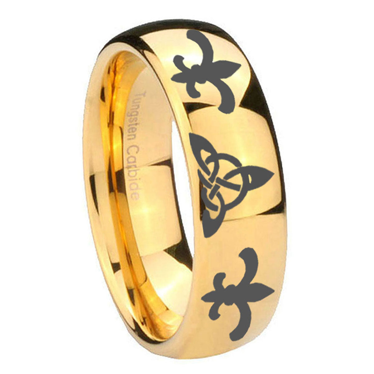5, 8mm Celtic Triangle Fleur De Lis Dome Gold Tungsten Carbide Men's Wedding Band