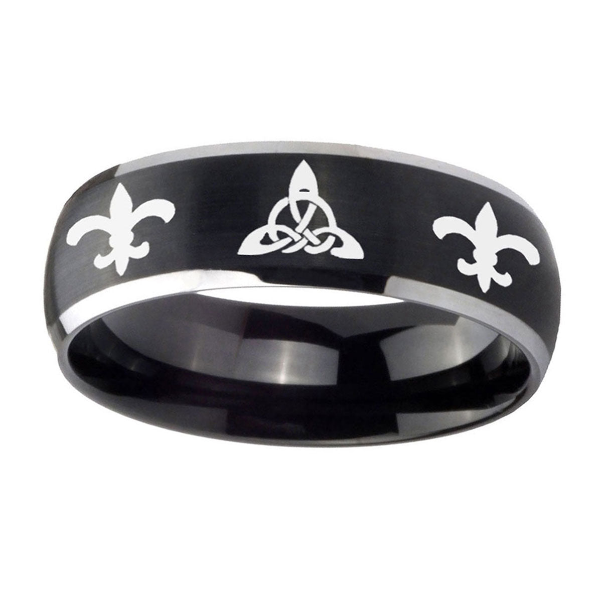 5, 8mm Celtic Triangle Fleur De Lis Dome Brushed Black 2 Tone Tungsten Promise Ring