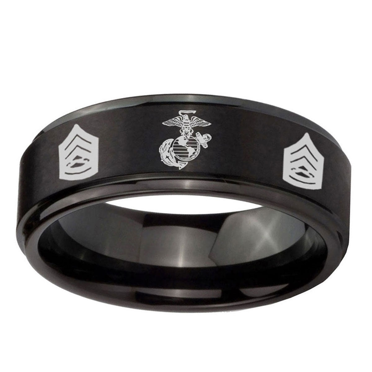 Style the 10mm Marine Army Sergeant Step Edges Brush Black Tungsten Carbide Mens Ring. This brushed black ring with step edges and Marine Army Sergeant design is perfect for men.