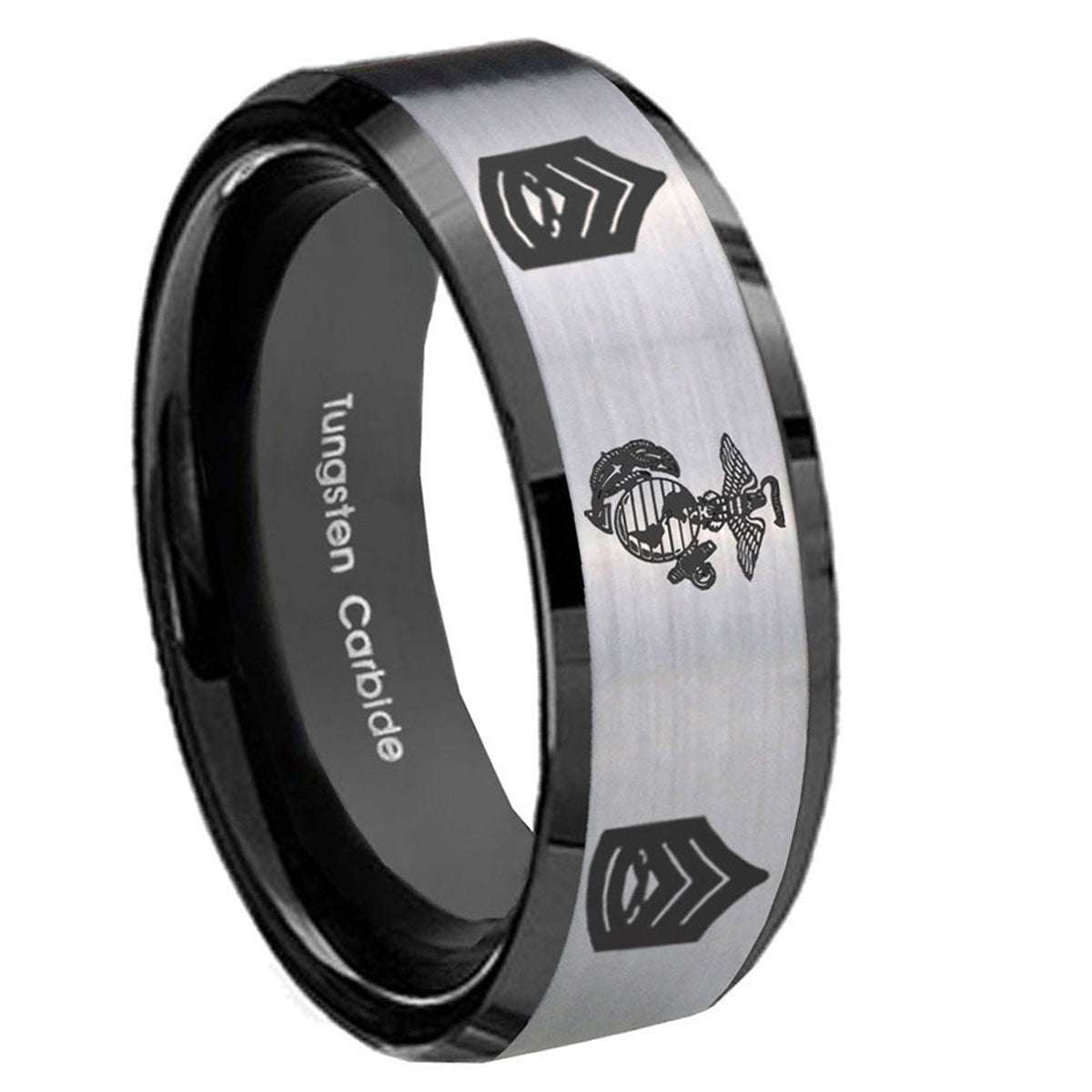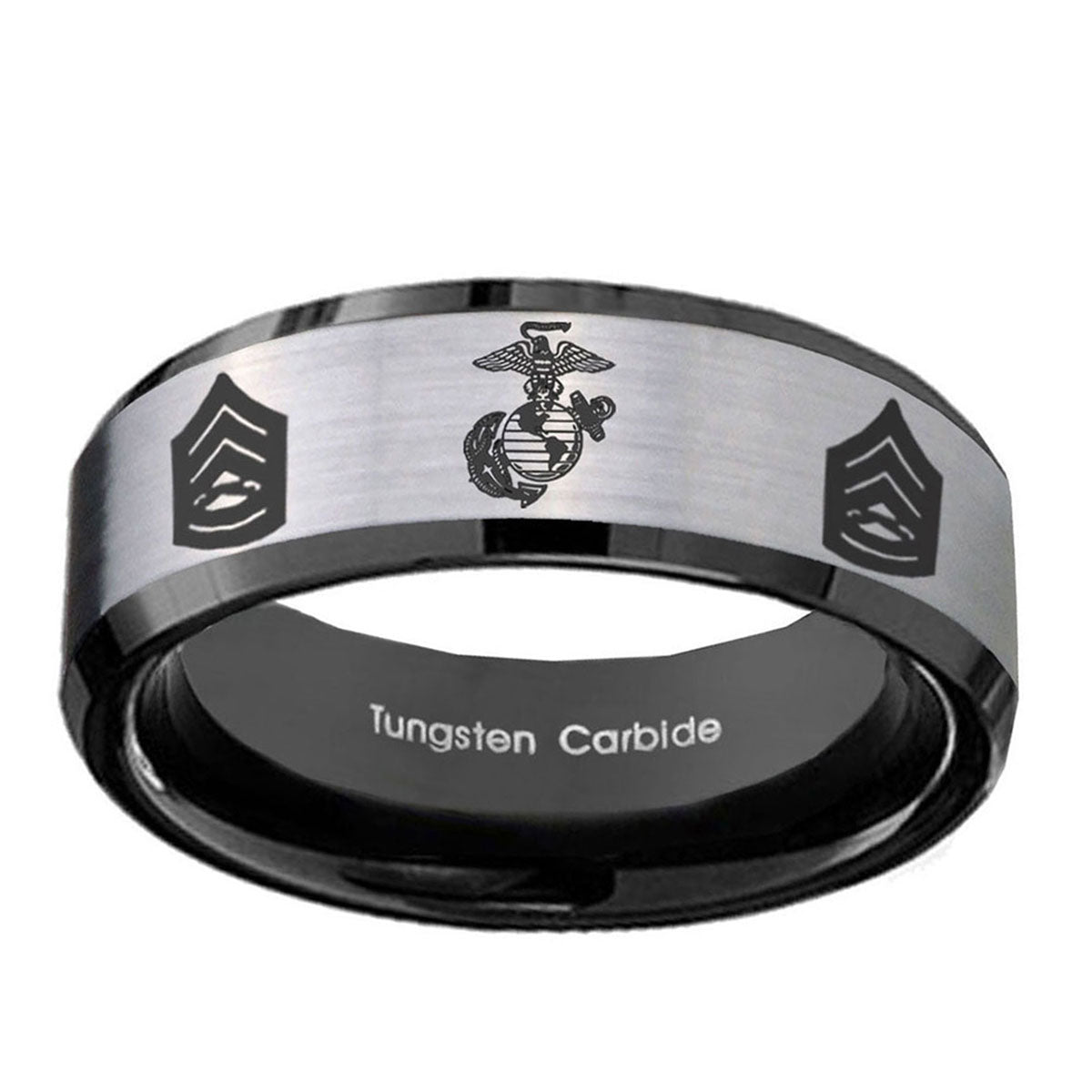 Introuding 5, 8mm Marine Army Sergeant Beveled Edges Brush Black 2 Tone Tungsten Men's Bands Ring . Offer in both 5mm and 8mm band width brush black 2 tone finished from size 4 to 14