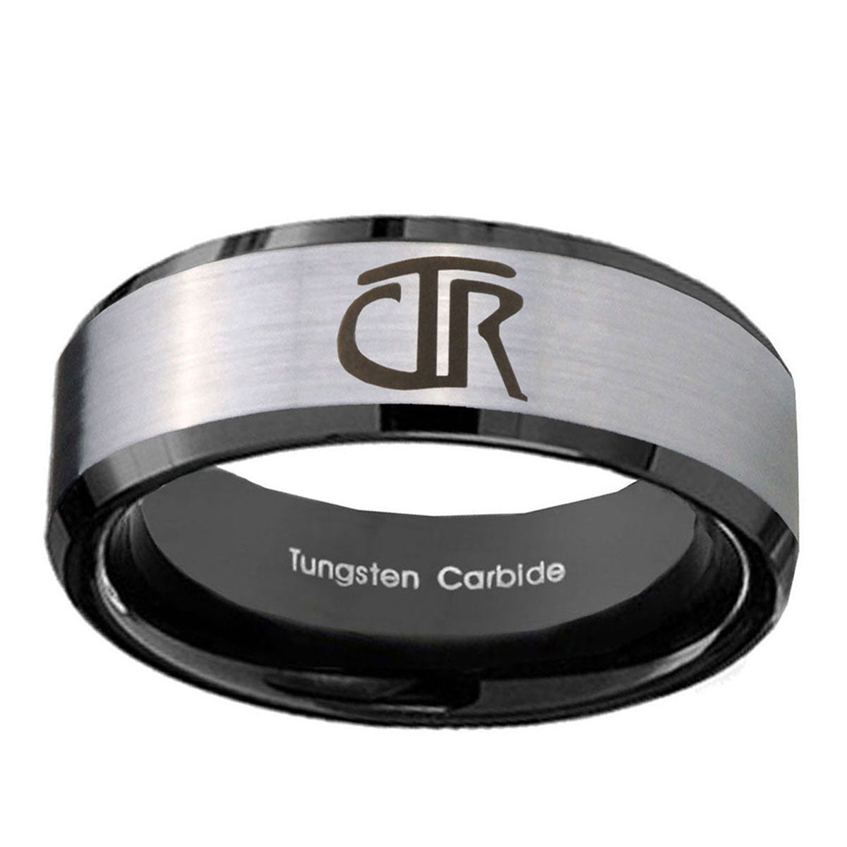 Personalize the 10mm CTR Beveled Edges Brushed Silver Black Tungsten Wedding Engraving Ring. This silver and black tungsten ring with CTR design is perfect for custom engravings.