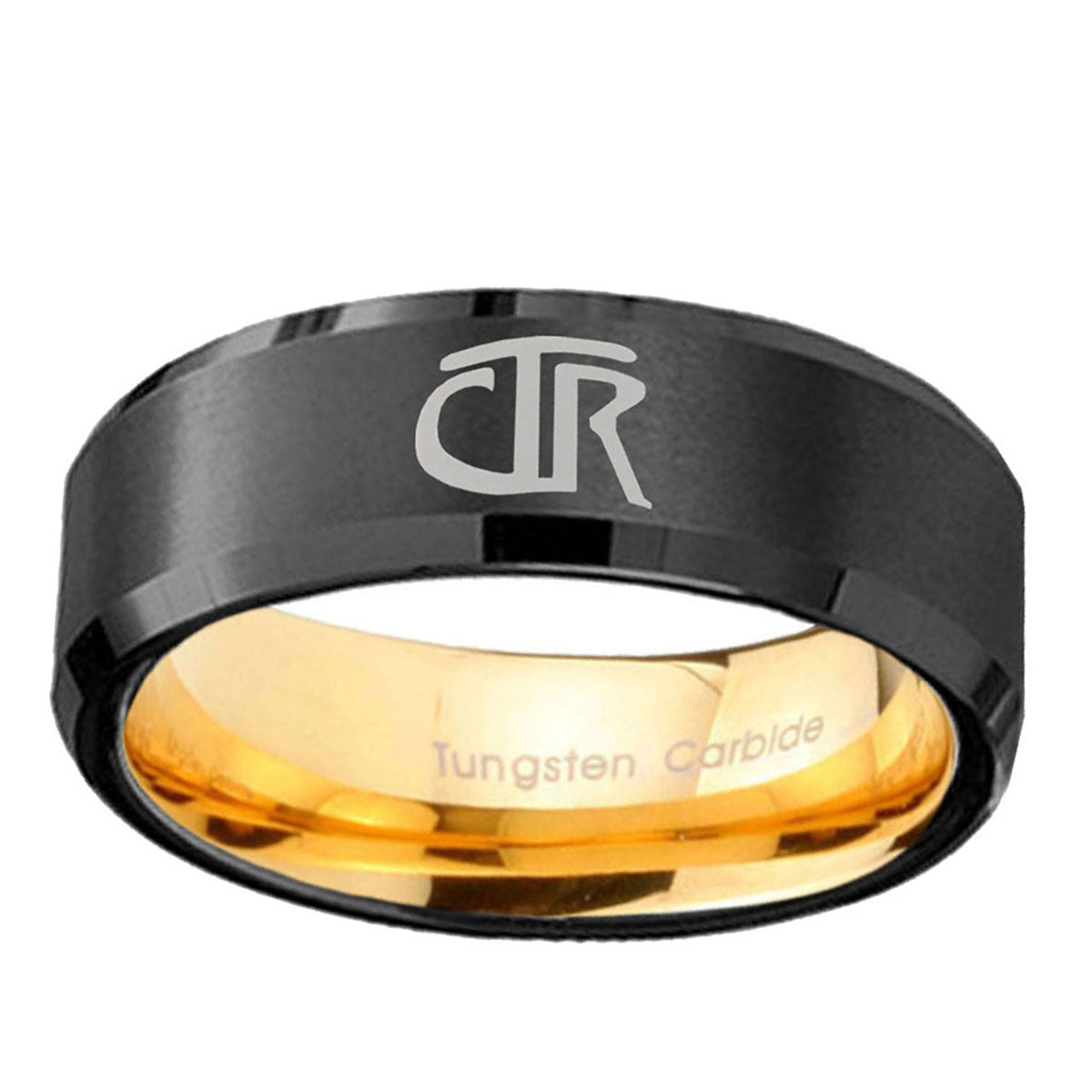 Introuding 8mm CTR Beveled Tungsten Carbide Black Gold Mens Promise Ring . Offer in 8mm band width black and gold plated finished from size 7 to 14