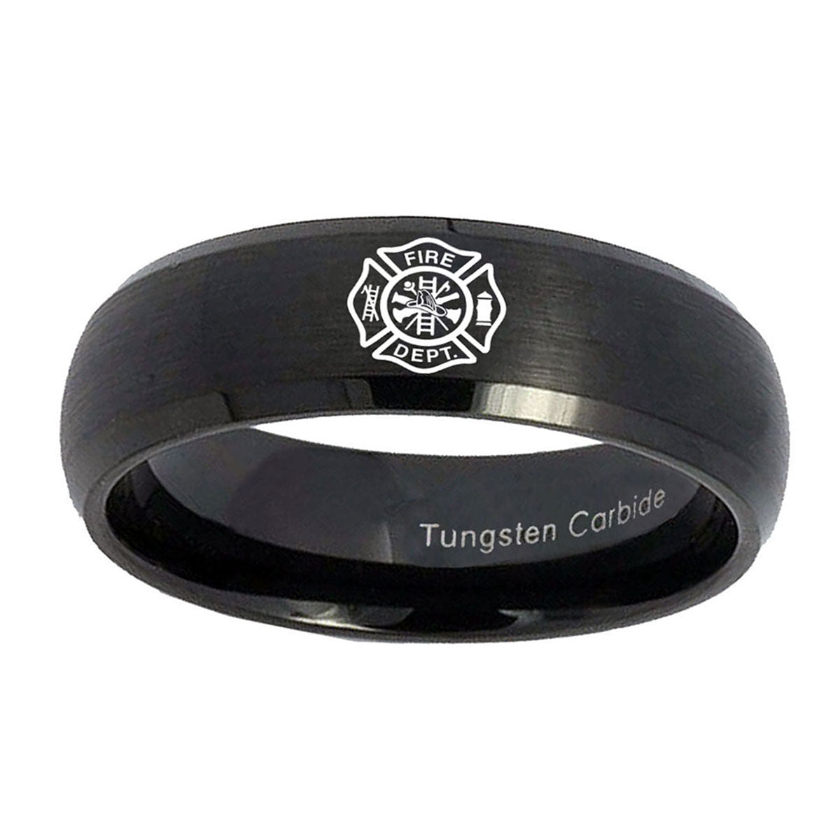 Celebrate with the 10mm Fire Department Dome Brush Black Tungsten Carbide Wedding Bands Ring. This brushed black dome ring with Fire Department design is perfect for weddings.