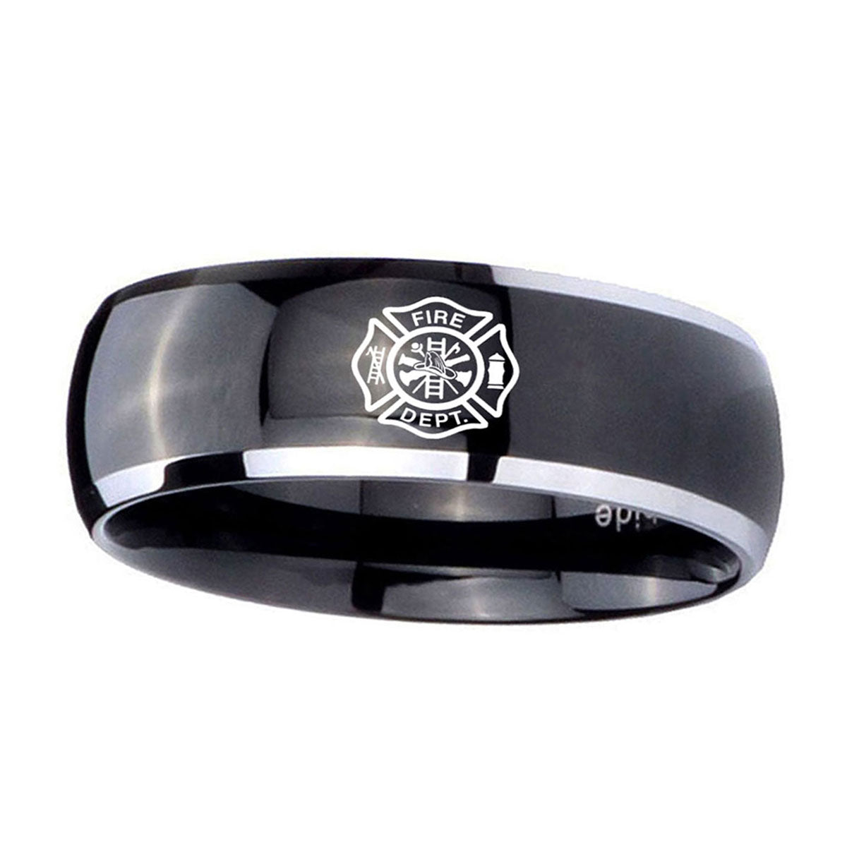 Style the 10mm Fire Department Dome Glossy Black 2 Tone Tungsten Carbide Men's Ring. This glossy black and 2-tone dome ring with Fire Department design is perfect for men.