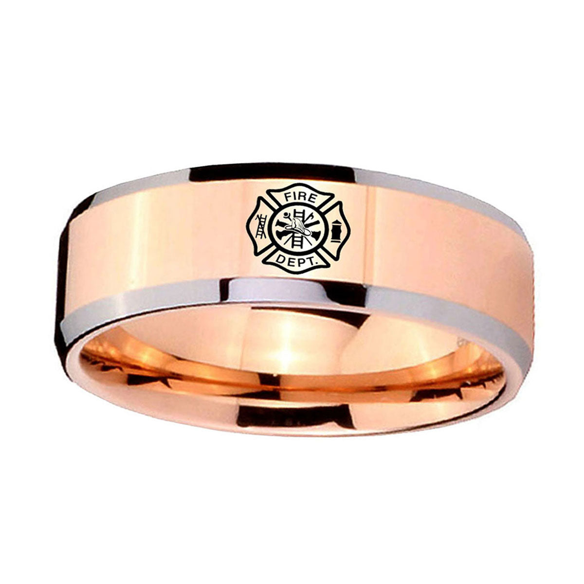 Introuding 5, 8mm Fire Department Beveled Edges Rose Gold Tungsten Mens Engagement Band . Offer in both 5mm and 8mm band width rose gold two tone finished from size 4 to 14