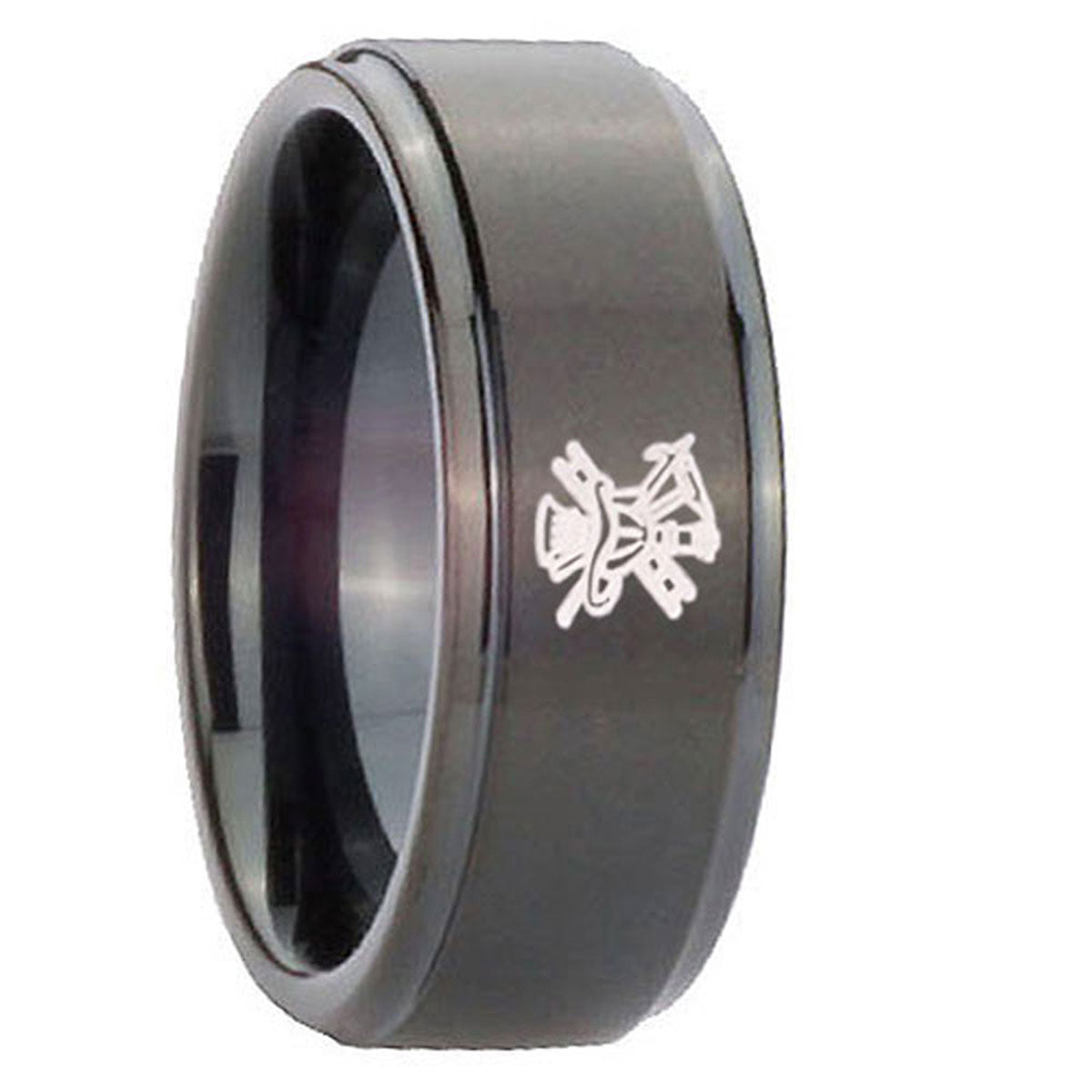 Celebrate milestones with the 10mm Fireman Step Edges Brush Black Tungsten Carbide Mens Anniversary Ring. This brushed black ring with step edges and Fireman design is perfect for anniversaries.