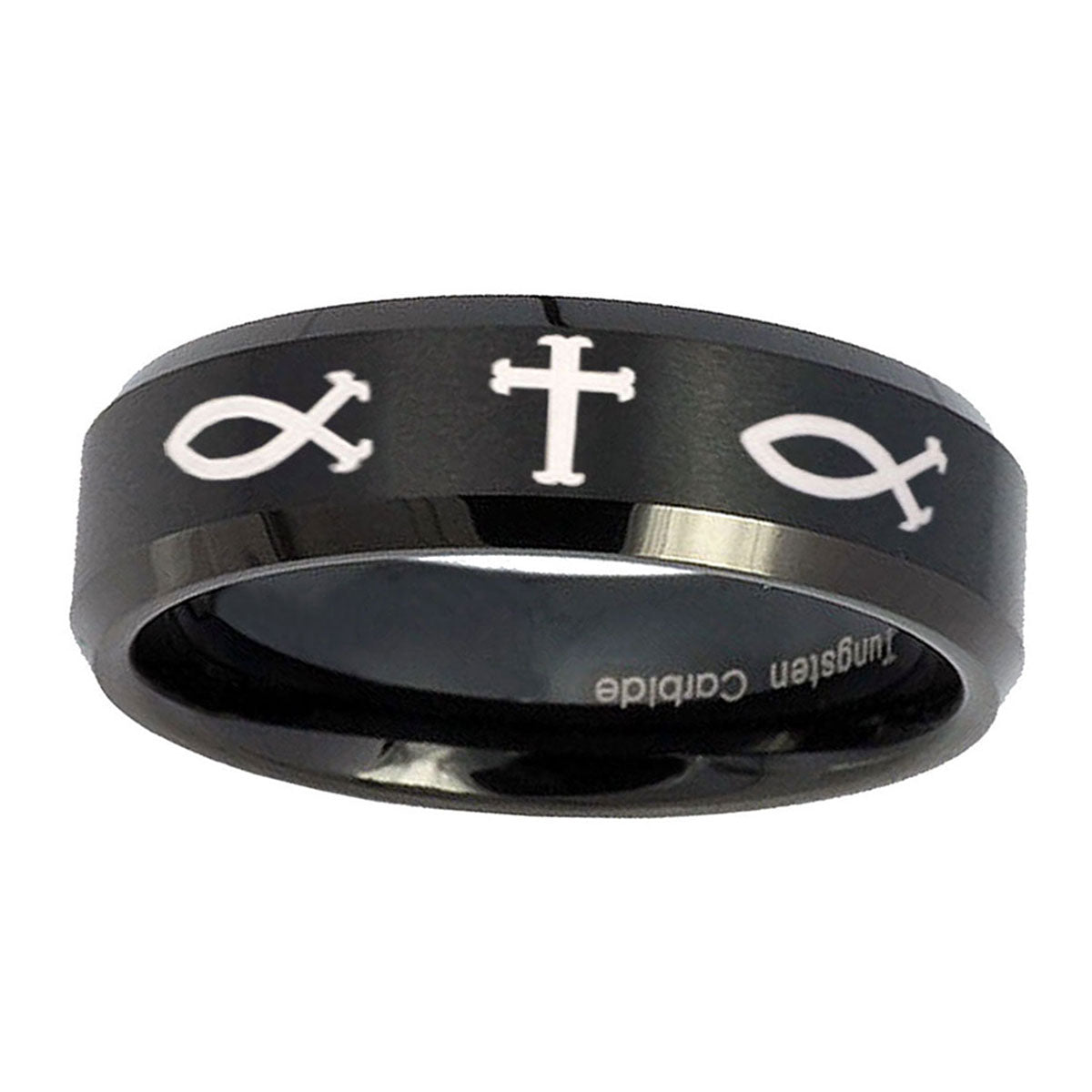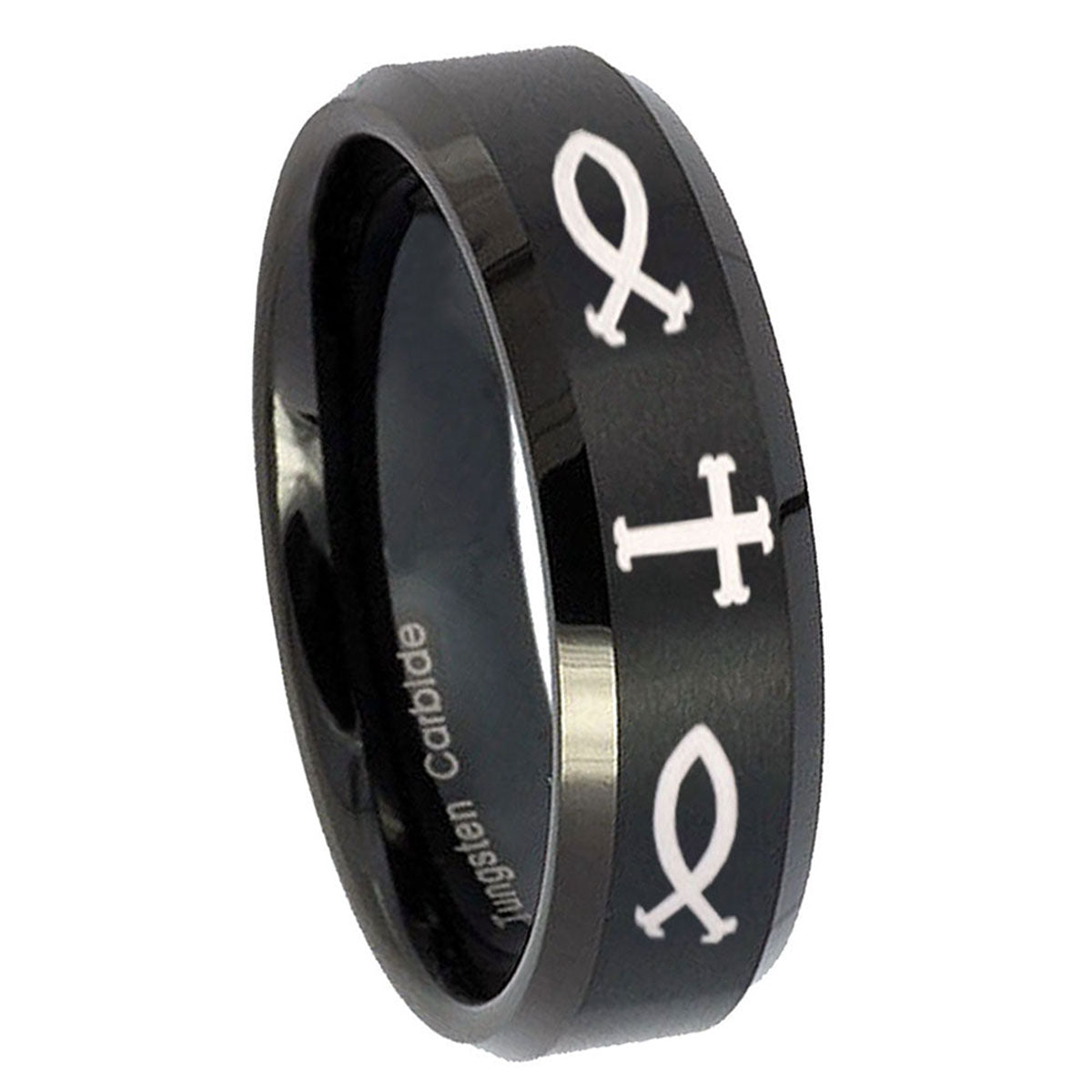 Personalize the 10mm Fish & Cross Beveled Edges Brush Black Tungsten Wedding Engraving Ring. This brushed black tungsten ring with Fish & Cross design is perfect for custom engravings.