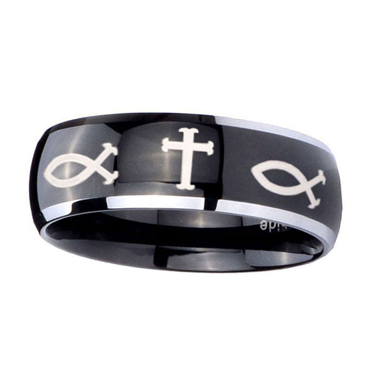 Celebrate milestones with the 10mm Fish & Cross Dome Glossy Black 2 Tone Tungsten Mens Anniversary Ring. This glossy black and 2-tone dome ring with Fish & Cross design is perfect for anniversaries.