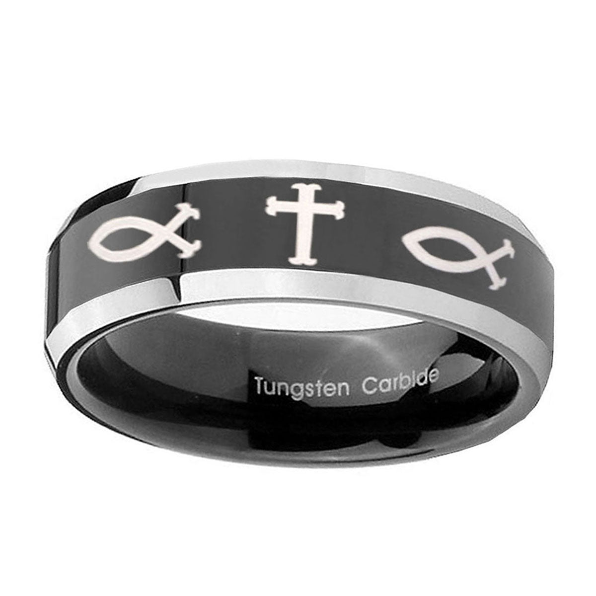 Celebrate with the 10mm Fish & Cross Beveled Edges Glossy Black 2 Tone Tungsten Mens Wedding Ring. This glossy black and 2-tone tungsten ring with Fish & Cross design is perfect for weddings.