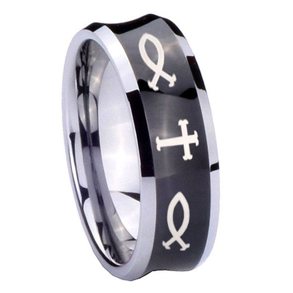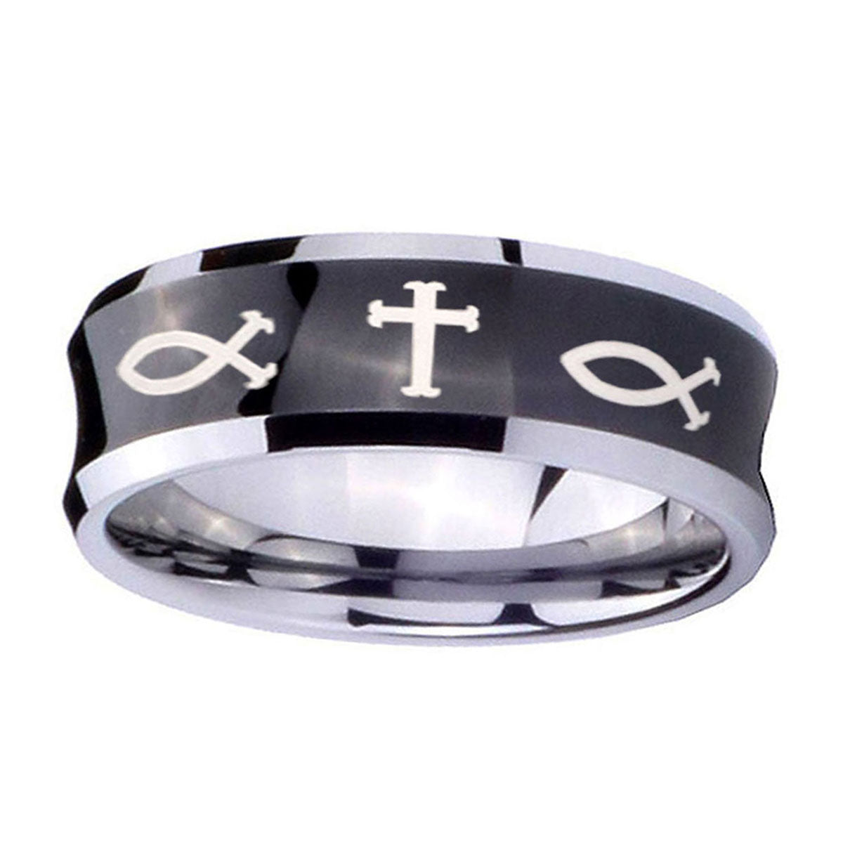 Celebrate with the 10mm Fish & Cross Concave Black Tungsten Carbide Wedding Bands Ring. This concave black tungsten ring with Fish & Cross design is perfect for weddings.