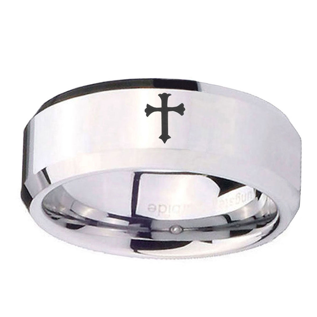 Propose with the 10mm Flat Christian Cross Beveled Edges Silver Tungsten Men's Engagement Band. This silver tungsten ring with Flat Christian Cross design is ideal for engagements.