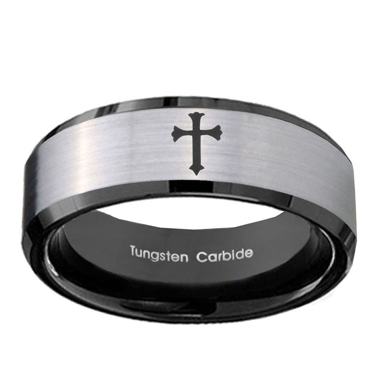 Style the 10mm Flat Christian Cross Beveled Brushed Silver Black Tungsten Men's Band Ring. This silver and black tungsten ring with Flat Christian Cross design is perfect for men.