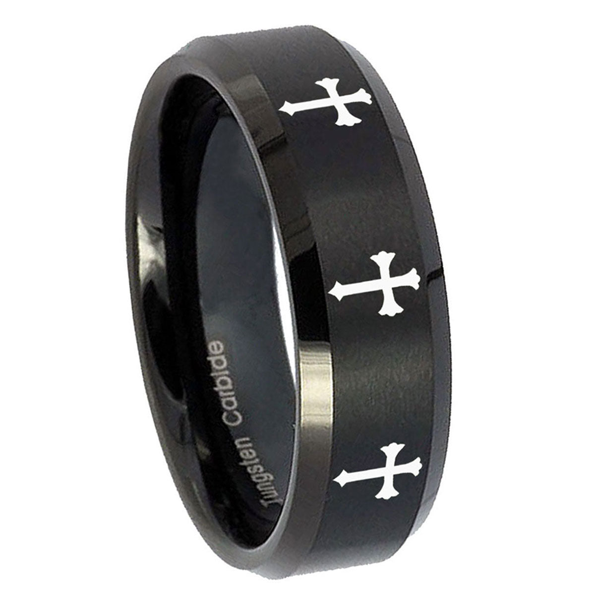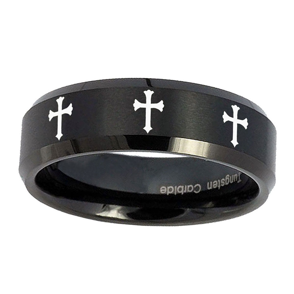 Celebrate with the 10mm Multiple Christian Cross Beveled Brush Black Tungsten Wedding Bands Ring. This brushed black tungsten ring with Multiple Christian Cross design is perfect for weddings.