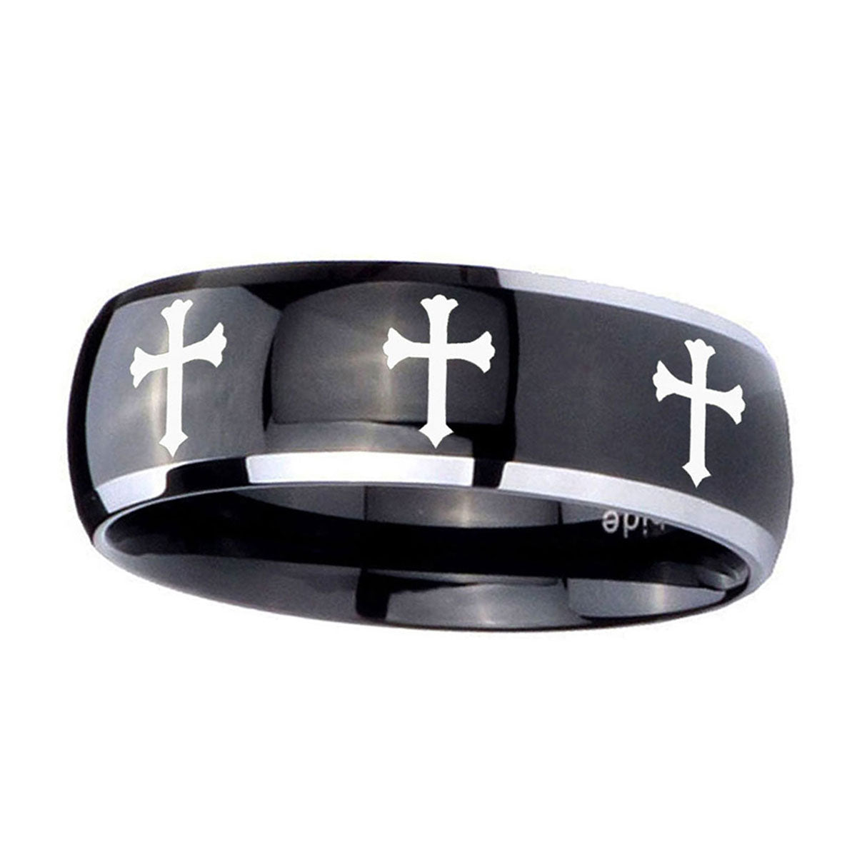 10mm Multiple Christian Cross Dome Glossy Black 2 Tone Tungsten Men's Ring