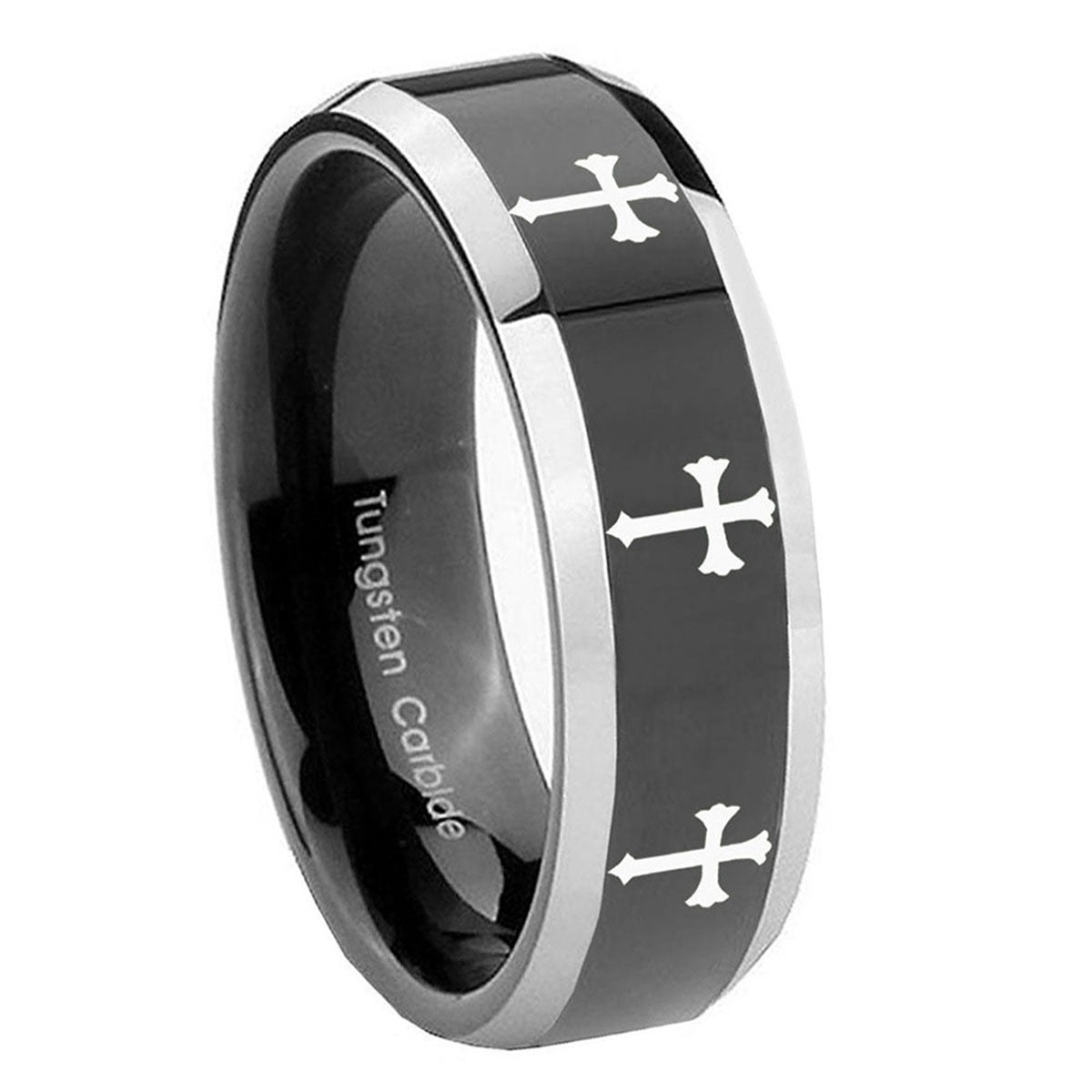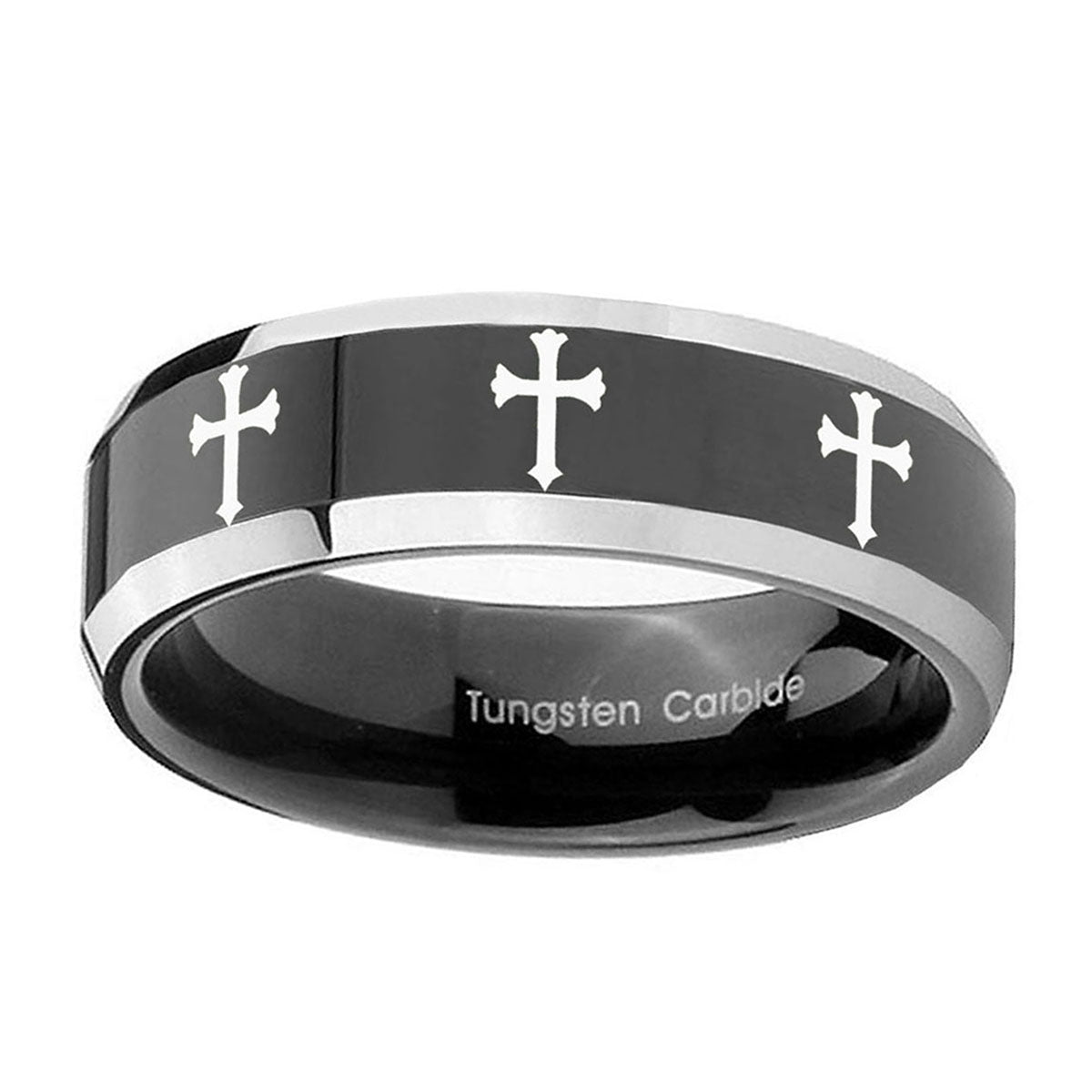 Celebrate with the 10mm Multiple Christian Cross Beveled Glossy Black 2 Tone Tungsten Bands Ring. This glossy black and 2-tone tungsten ring with Multiple Christian Cross design is perfect for weddings.