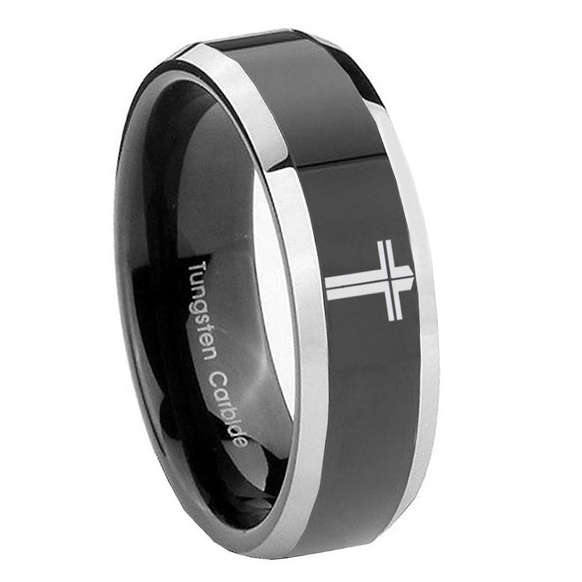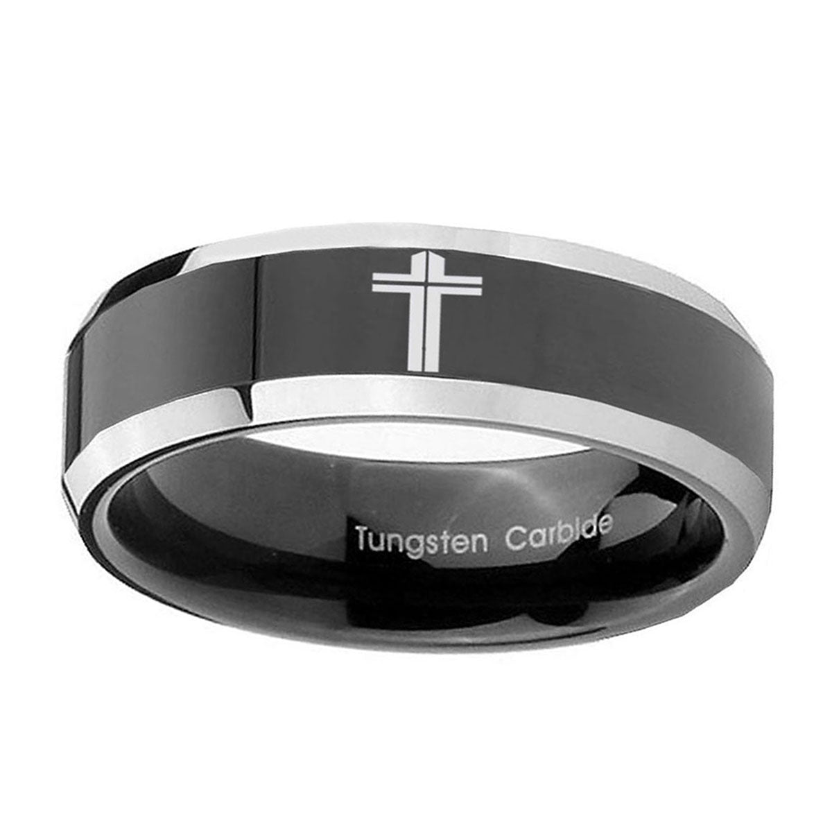 10mm Flat Christian Cross Beveled Glossy Black 2 Tone Tungsten Engagement Ring