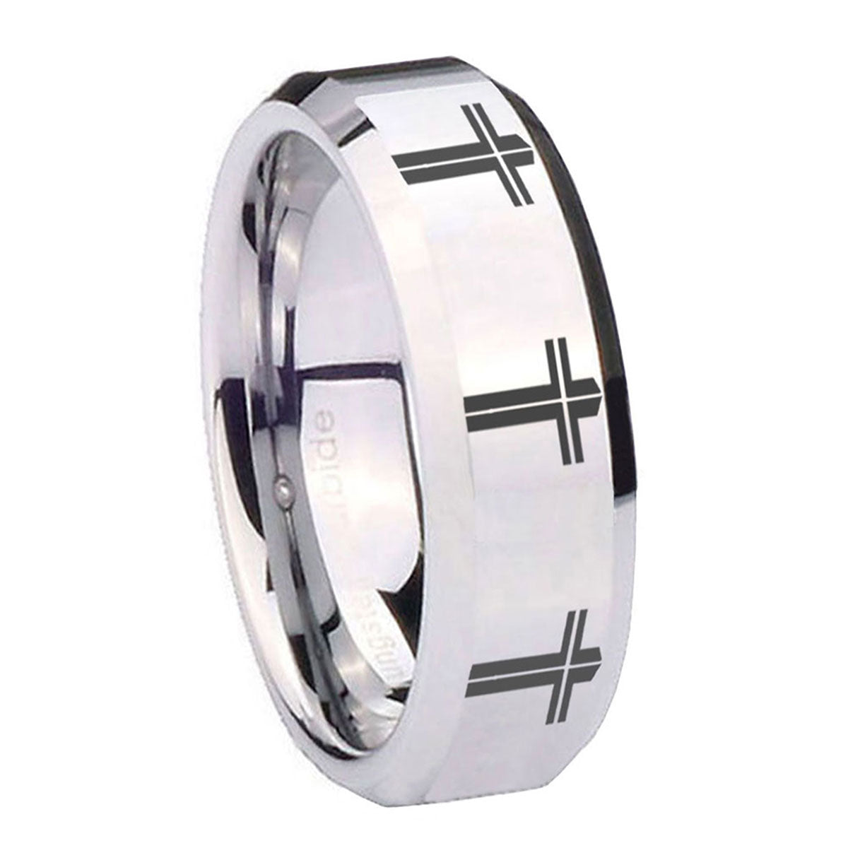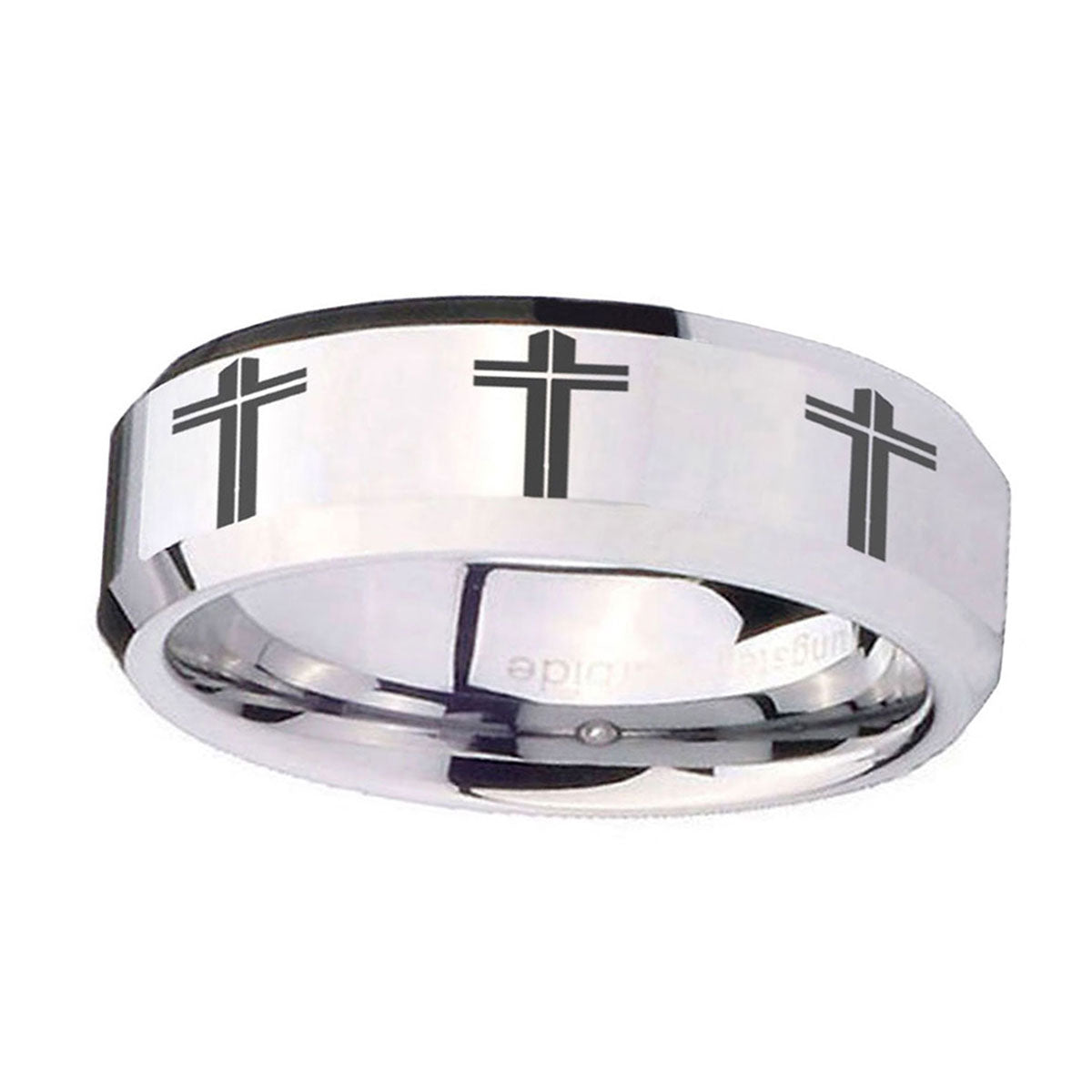 10mm Multiple Christian Cross Beveled Edges Silver Tungsten Engagement Ring