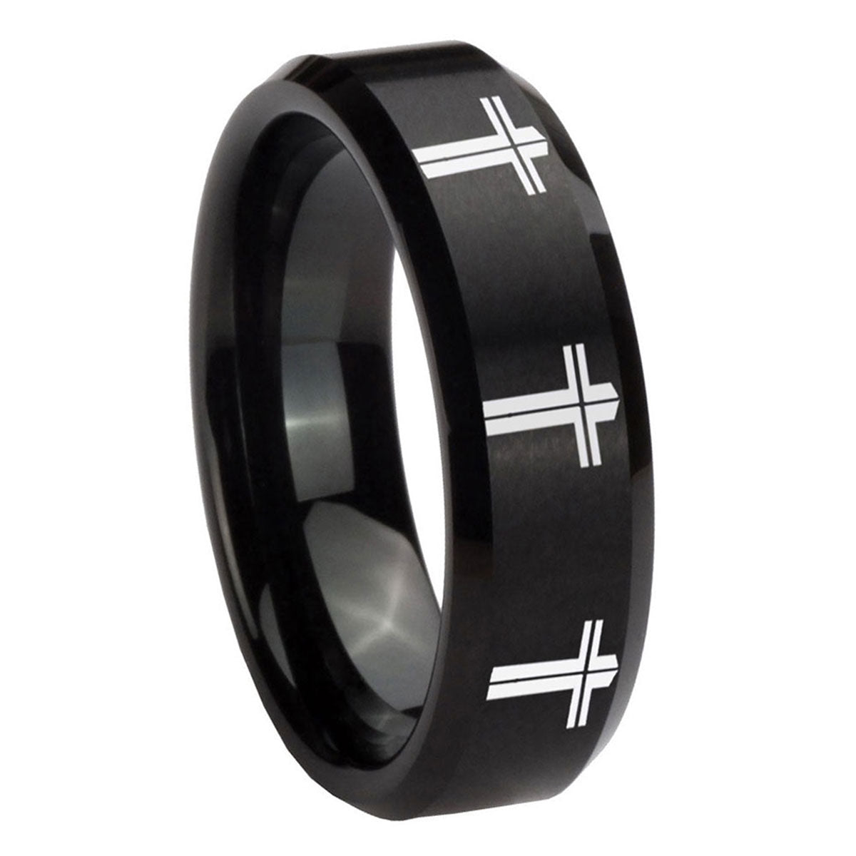 Propose with the 10mm Multiple Christian Cross Beveled Brush Black Tungsten Men's Engagement Ring. This brushed black tungsten ring with Multiple Christian Cross design is ideal for engagements.