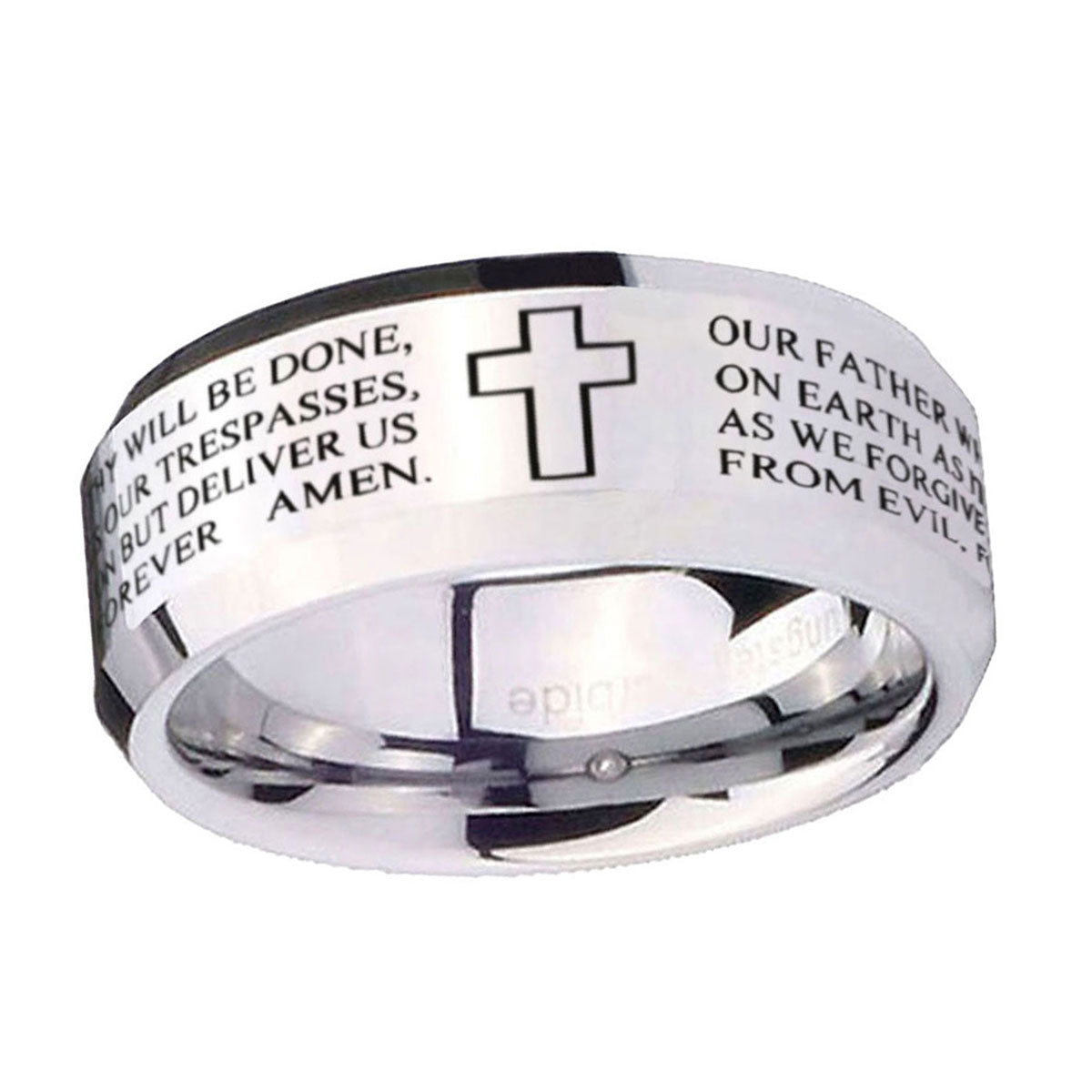 Personalize the 10mm Bible Lord's Prayer Cross Beveled Edges Silver Tungsten Carbide Mens Ring Engraved. This silver tungsten ring with cross and Lord's Prayer design is perfect for custom engravings.