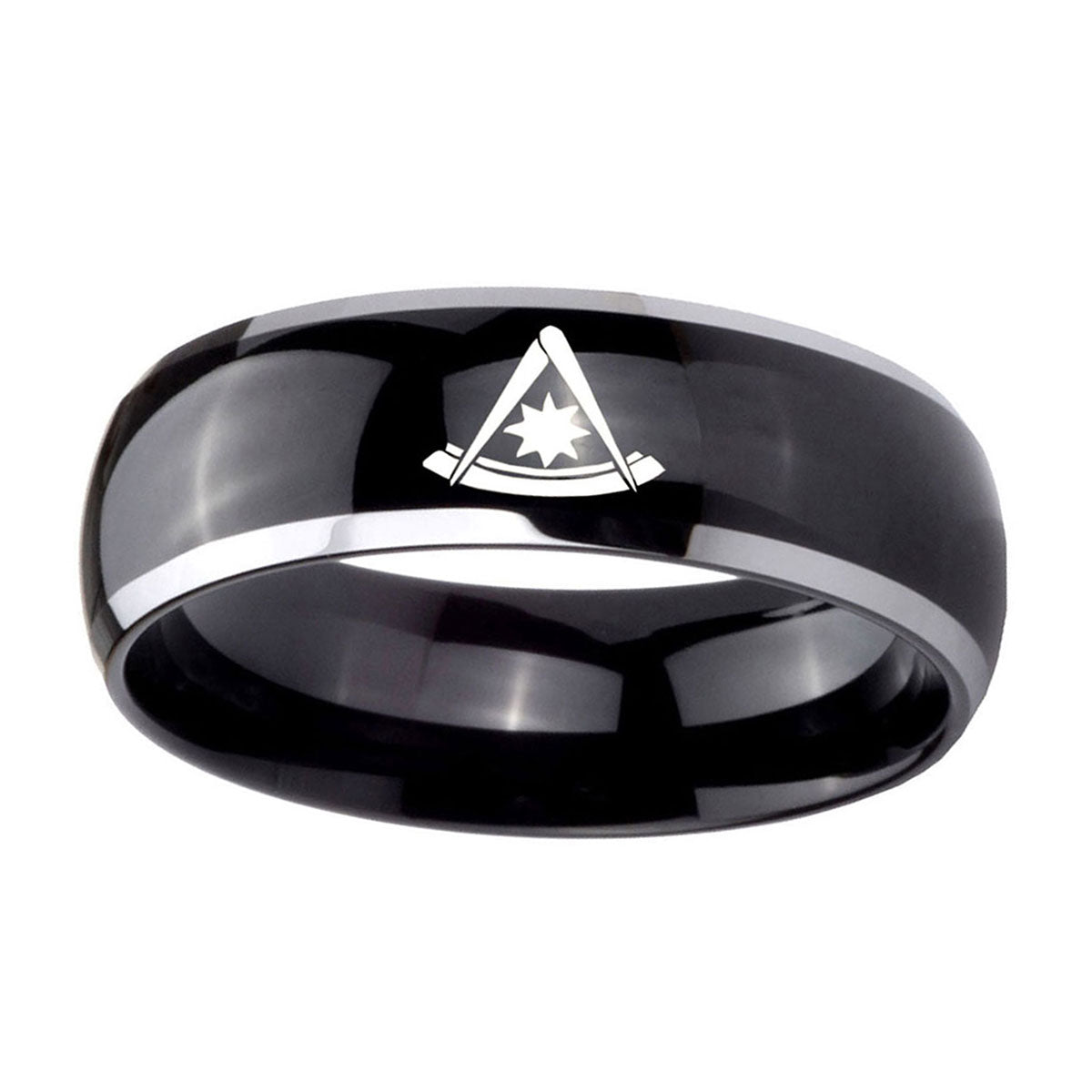 Introuding 5, 8mm Pester Master Masonic Dome Glossy Black 2 Tone Tungsten Custom Mens Ring . Offer in both 5mm and 8mm band width polished black plated two tone finished from size 4 to 14