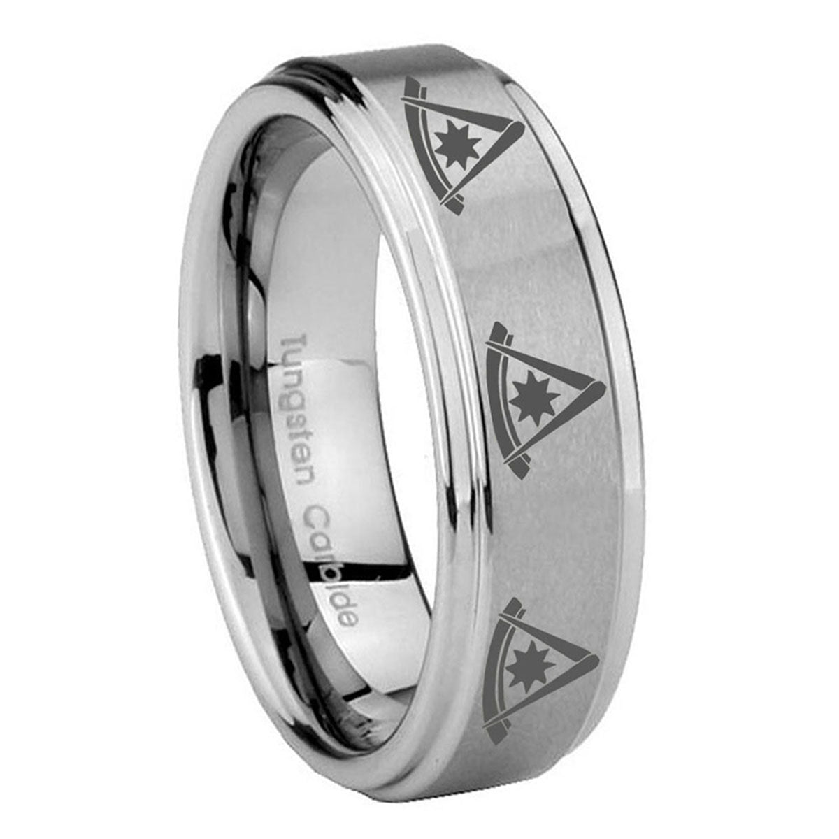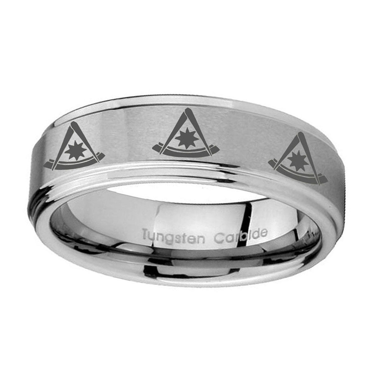 Introuding 5, 8mm Multiple Pester Master Masonic Step Edges Brushed Tungsten Mens Ring . Offer in both 5mm and 8mm band width brushed grey fnished from size 4 to 14