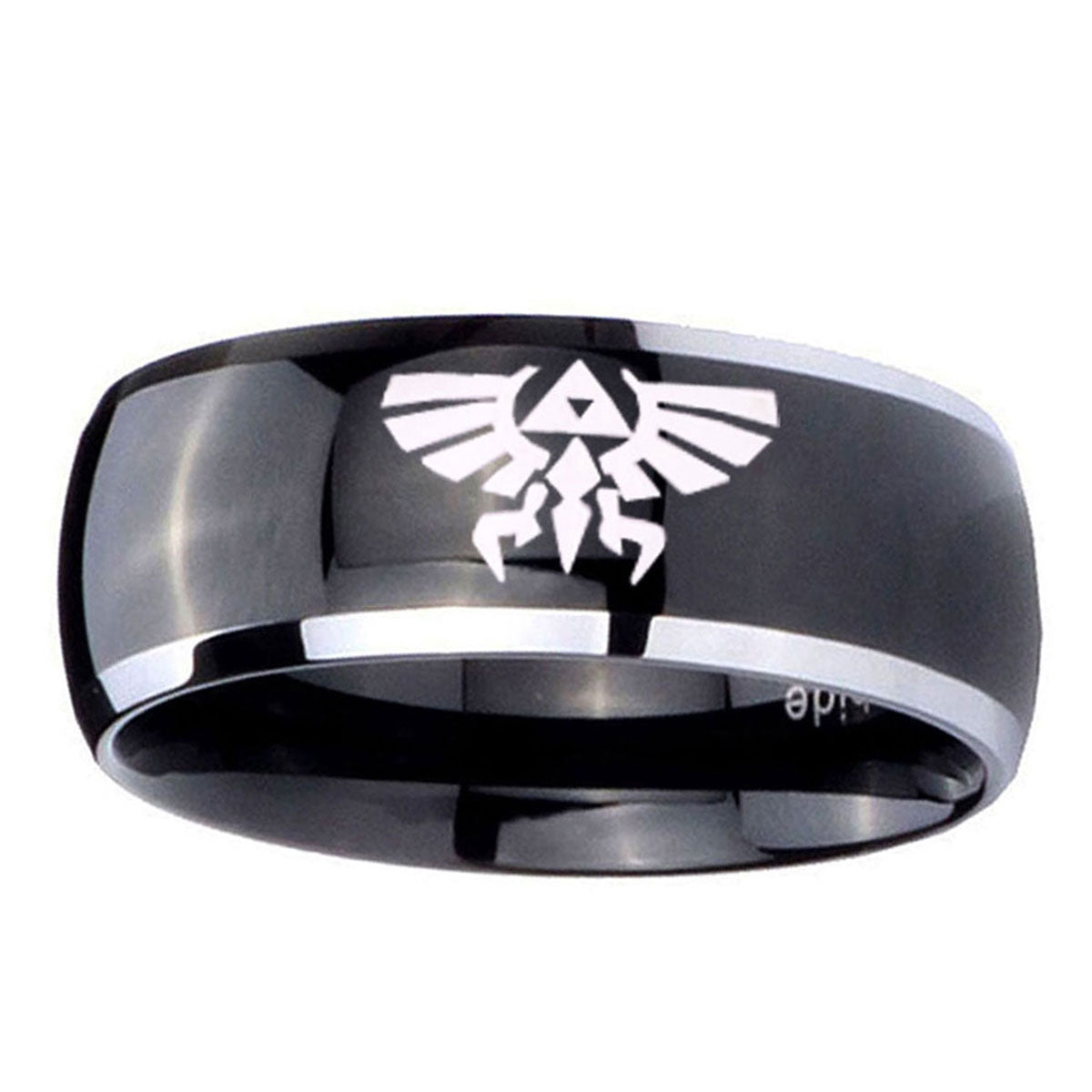 Propose with the 10mm Zelda Skyward Sword Dome Glossy Black 2 Tone Tungsten Men's Engagement Ring. This glossy black and 2-tone dome ring with Zelda Skyward Sword design is ideal for engagements.