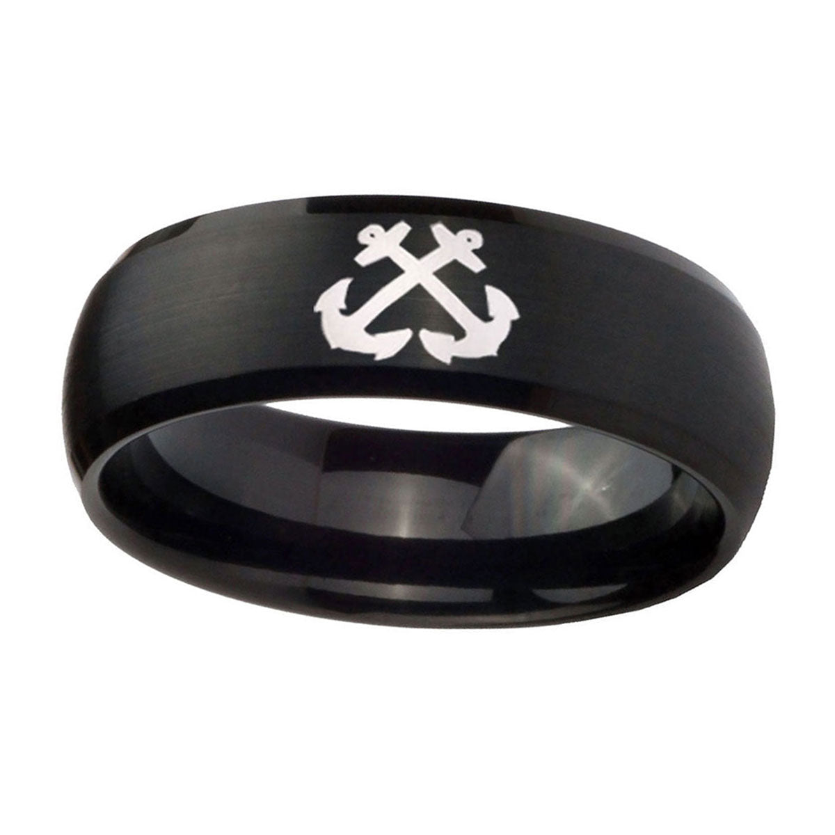 Propose with the 10mm Anchor Dome Brush Black Tungsten Carbide Mens Engagement Ring. This brushed black dome ring with anchor design is crafted for durability and style.