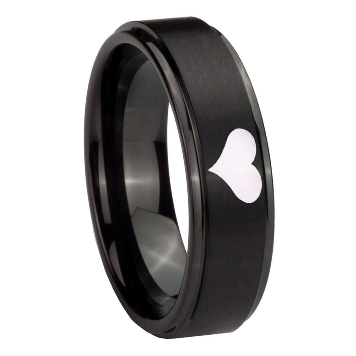 Propose with the 10mm Heart Step Edges Brush Black Tungsten Carbide Men's Engagement Ring. This brushed black ring with step edges and Heart design is ideal for engagements.