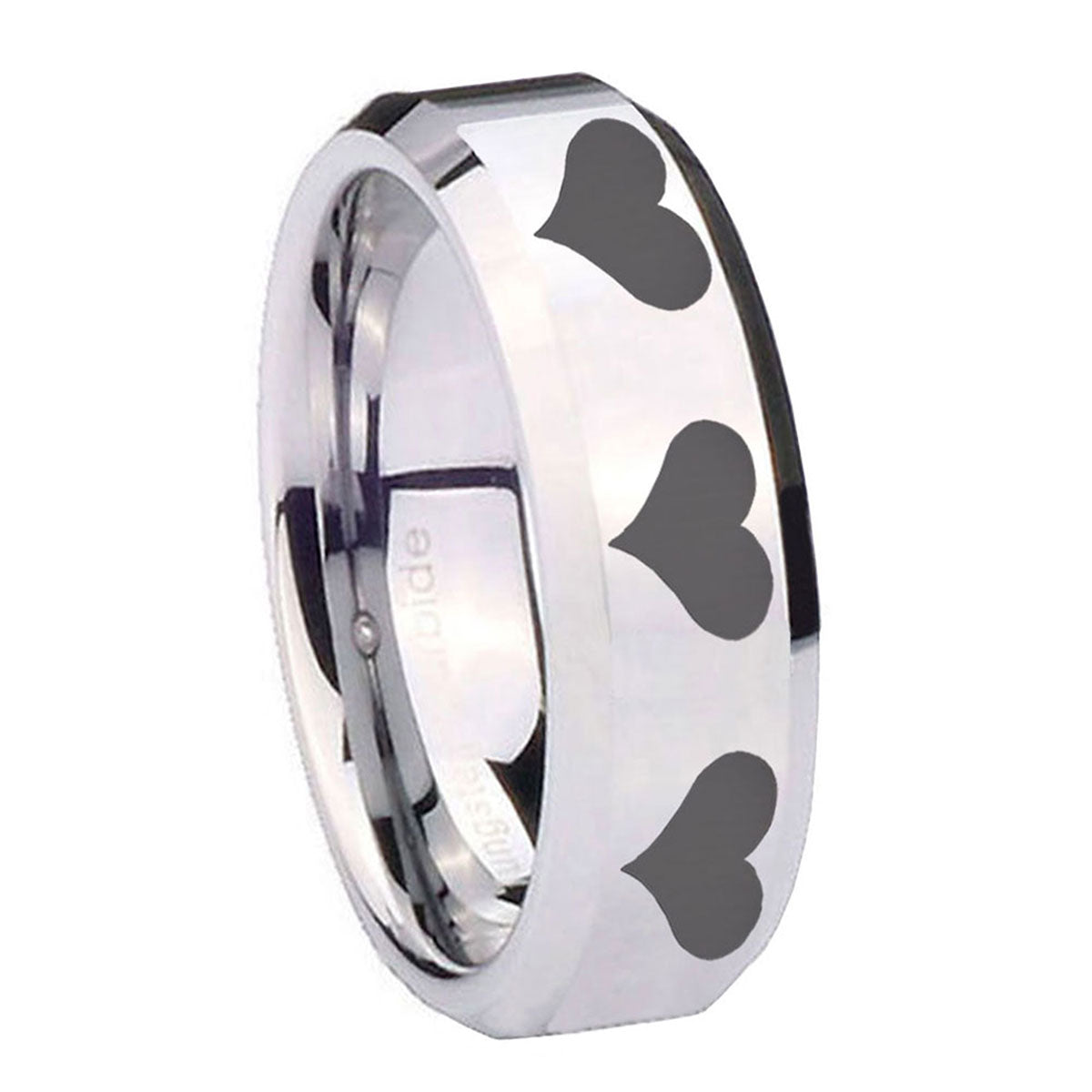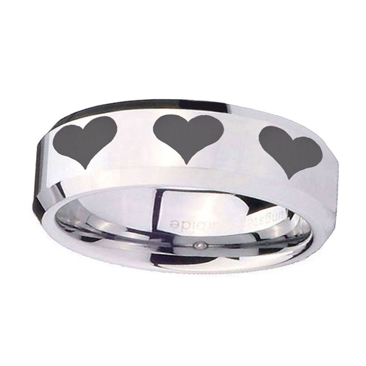 Celebrate with the 10mm Multiple Heart Beveled Edges Silver Tungsten Carbide Men's Wedding Band. This silver tungsten ring with Multiple Heart design is perfect for weddings.