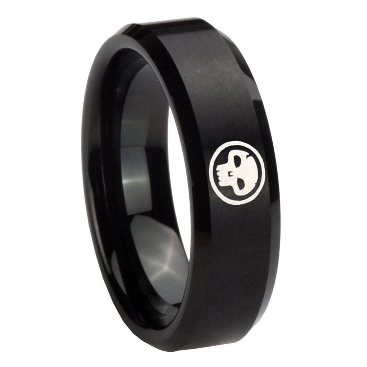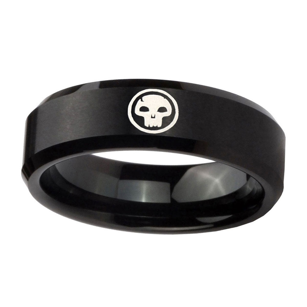 Propose with the 10mm Skull Beveled Edges Brush Black Tungsten Carbide Mens Engagement Ring. This brushed black tungsten ring with Skull design is ideal for engagements.