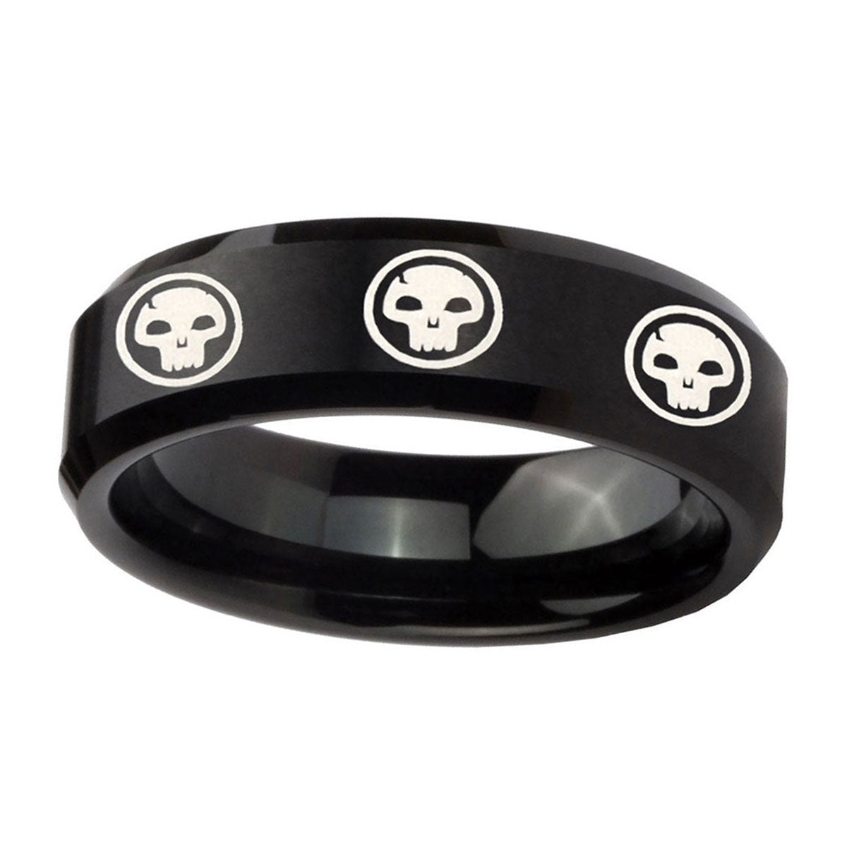10mm Multiple Skull Beveled Edges Brush Black Tungsten Men's Engagement Ring