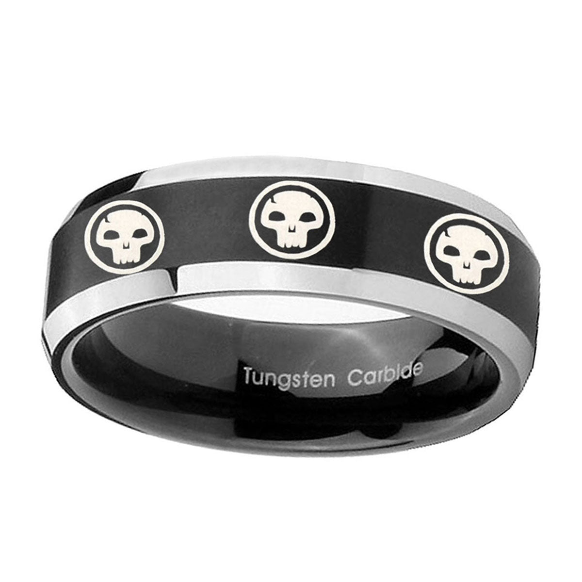 10mm Multiple Skull Beveled Brush Black 2 Tone Tungsten Mens Ring Engraved