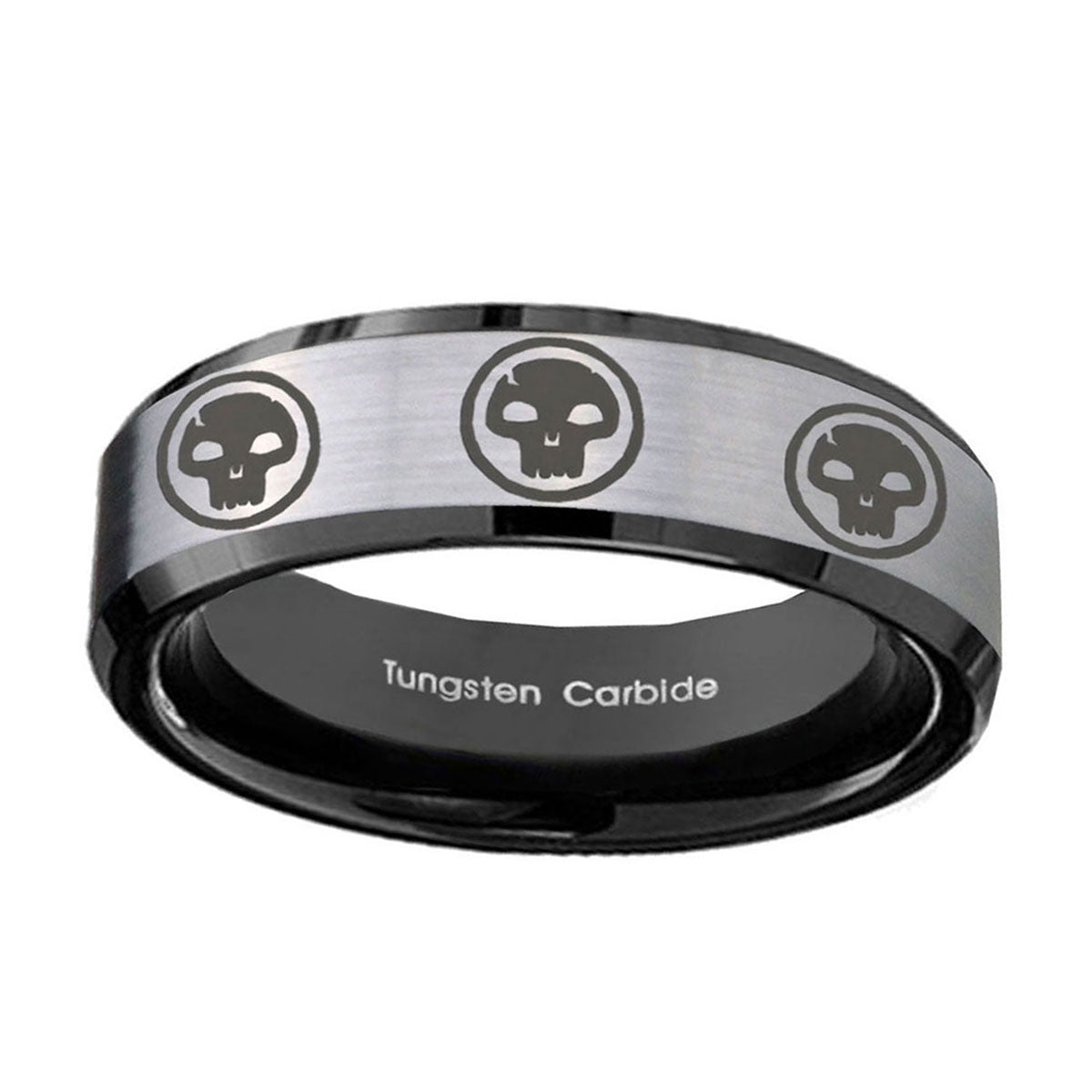 Celebrate with the 10mm Multiple Skull Beveled Brushed Silver Black Tungsten Mens Wedding Band. This silver and black tungsten ring with Multiple Skull design is perfect for weddings.