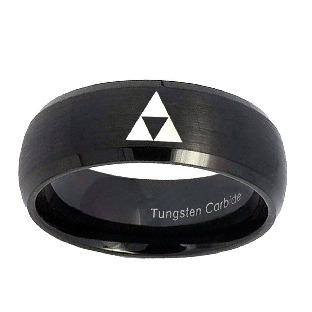 Style the 10mm Zelda Triforce Dome Brush Black Tungsten Carbide Mens Ring. This brushed black dome ring with Zelda Triforce design is perfect for men.