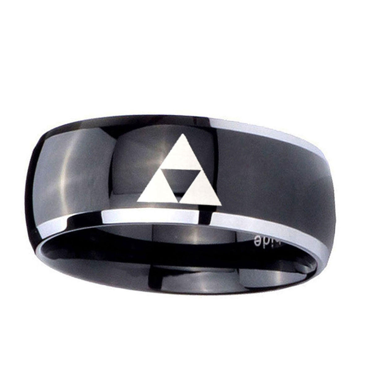 Celebrate with the 10mm Zelda Triforce Dome Glossy Black 2 Tone Tungsten Wedding Bands Ring. This glossy black and 2-tone dome ring with Zelda Triforce design is perfect for weddings.