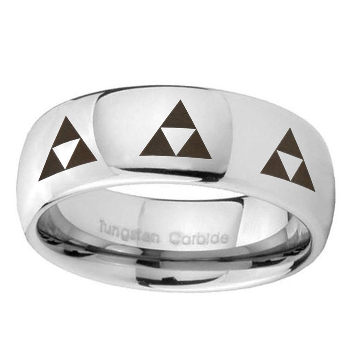 Celebrate milestones with the 10mm Multiple Zelda Triforce Mirror Dome Tungsten Carbide Mens Anniversary Ring. This polished mirror dome ring with Multiple Zelda Triforce design is perfect for anniversaries.