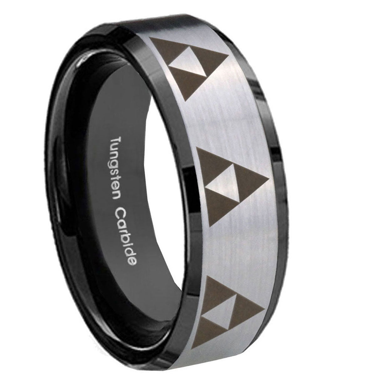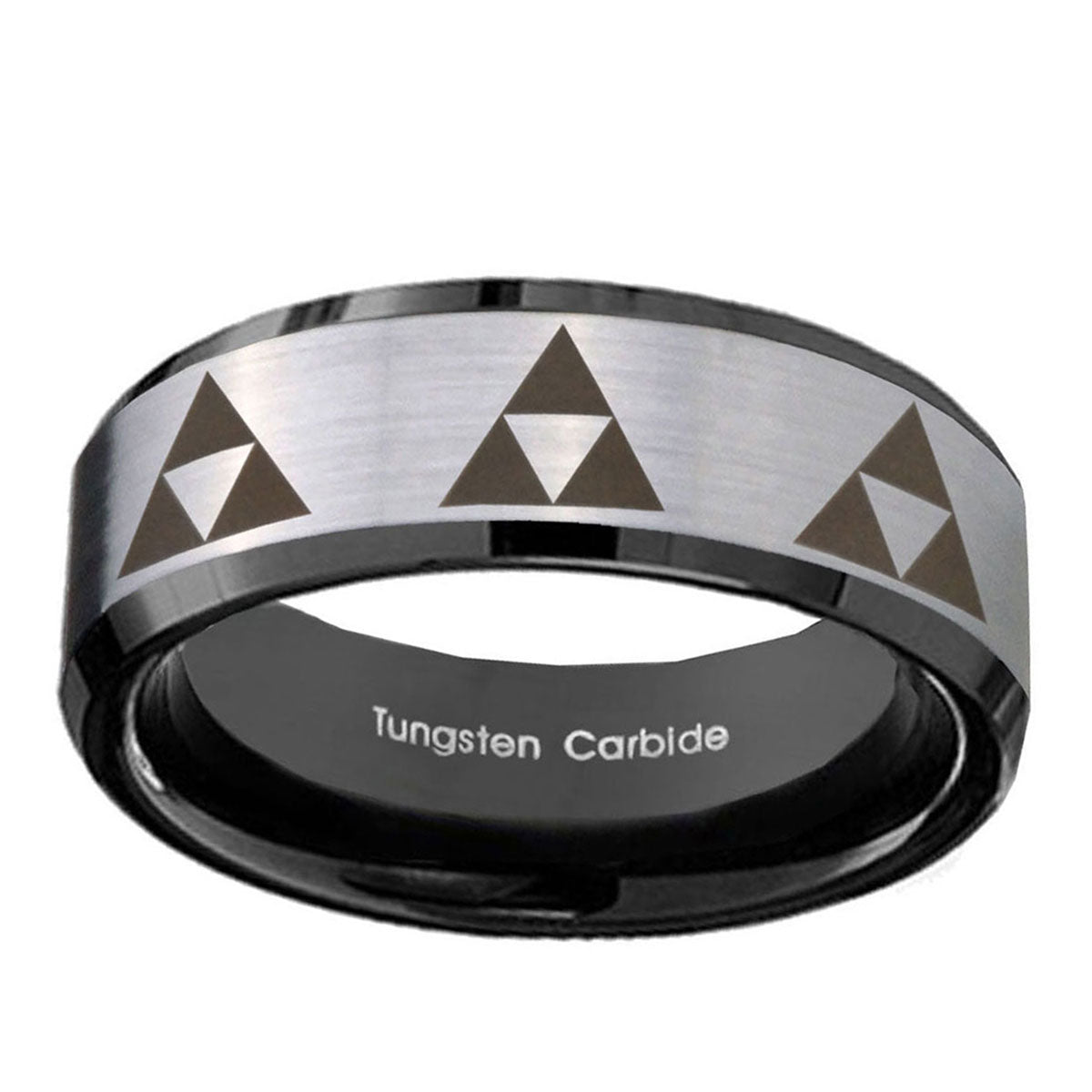 Style the 10mm Multiple Zelda Triforce Beveled Brushed Silver Black Tungsten Mens Ring. This silver and black tungsten ring with Multiple Zelda Triforce design is perfect for men.