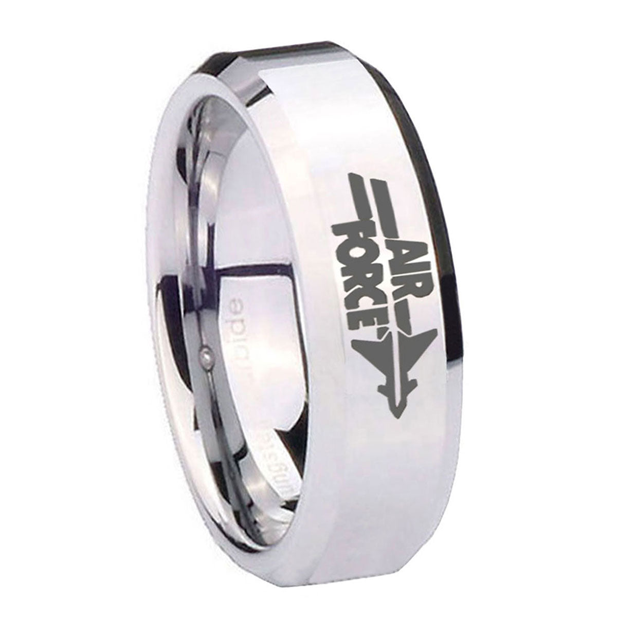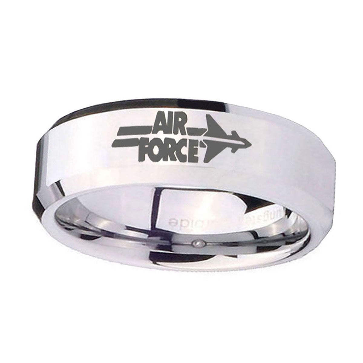 Honor service with the 10mm Beveled Air Force Mirror Beveled Edges Silver Tungsten Carbide Ring. This silver tungsten ring with Air Force design is perfect for veterans or enthusiasts.
