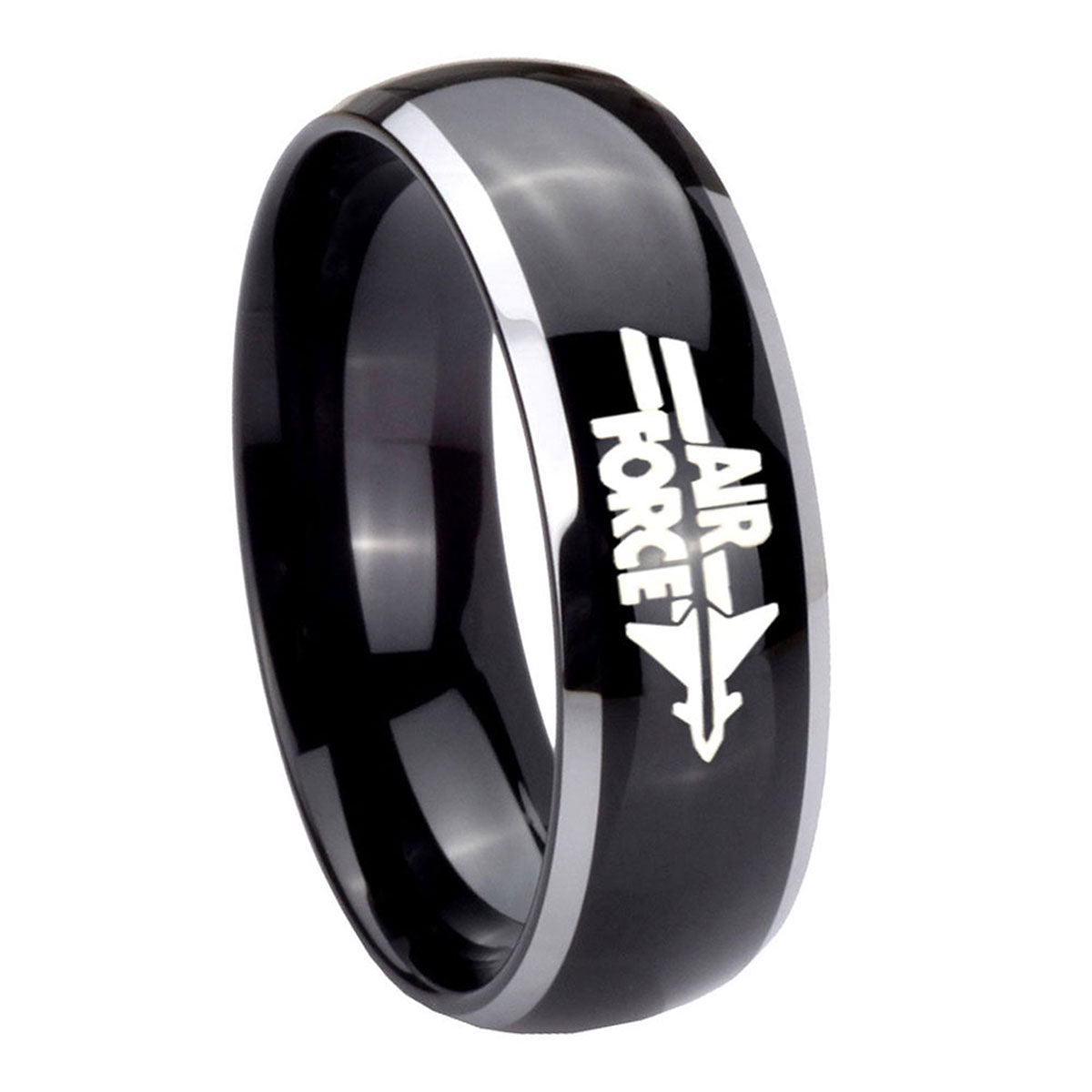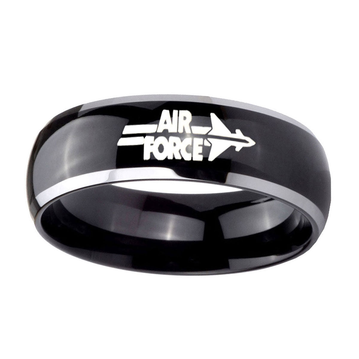 Introuding 5, 8mm Glossy Black Dome Air Force 2 Tone Tungsten Laser Engraved Ring . Offer in both 5mm and 8mm band width polished black plated two tone finished from size 4 to 14