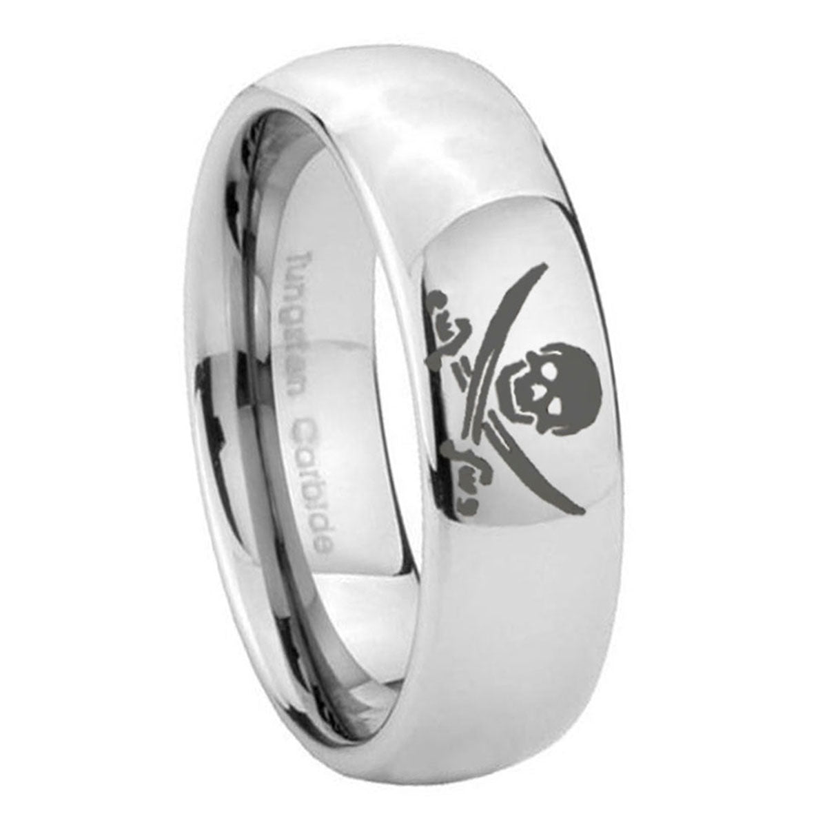 Celebrate with the 10mm Skull Pirate Mirror Dome Tungsten Carbide Wedding Bands Ring. This polished mirror dome ring with Skull Pirate design is perfect for weddings.