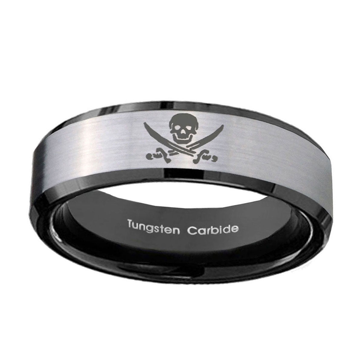 Customize the 10mm Skull Pirate Beveled Brushed Silver Black Tungsten Custom Ring for Men. This silver and black tungsten ring with Skull Pirate design is perfect for personalization.