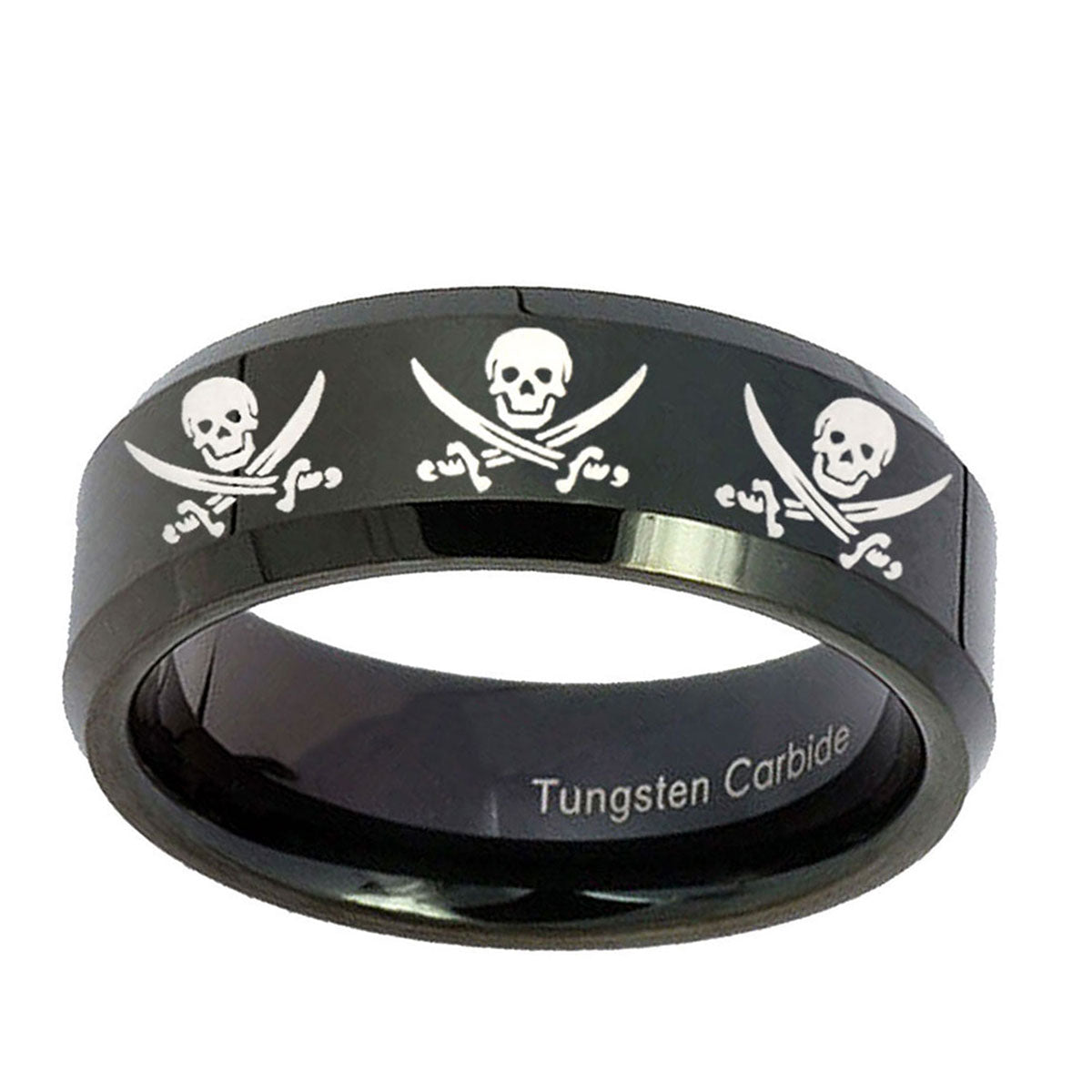 Propose with the 10mm Multiple Skull Pirate Beveled Edges Black Tungsten Men's Engagement Ring. This black tungsten ring with Multiple Skull Pirate design is ideal for engagements.