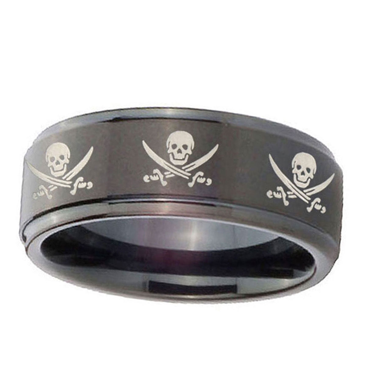 10mm Multiple Skull Pirate Step Edges Brush Black Tungsten Mens Engagement Ring