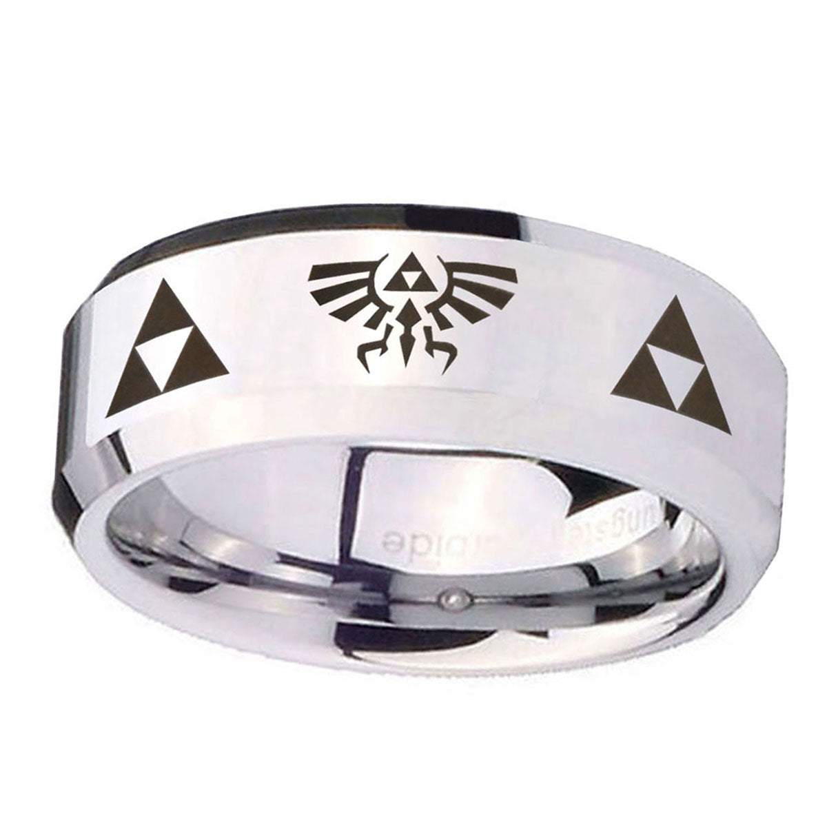 Introuding 5, 8mm Legend of Zelda Beveled Edges Silver Tungsten Carbide Men's Ring . Offer in both 5mm and 8mm band width polished silver fnished from size 4 to 14