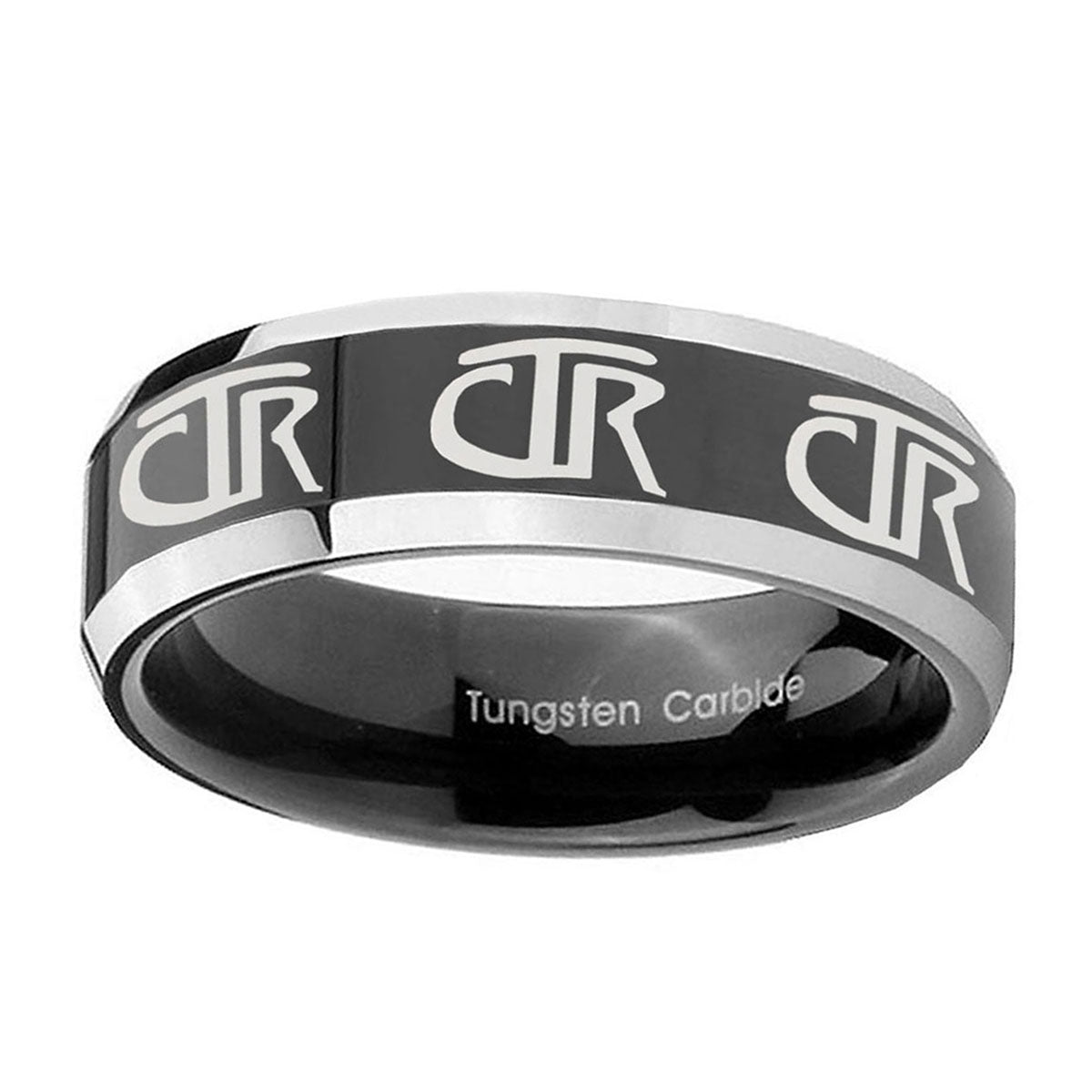 Propose with the 10mm Multiple CTR Beveled Glossy Black 2 Tone Tungsten Wedding Engagement Ring. This glossy black and 2-tone tungsten ring with Multiple CTR design is ideal for engagements.