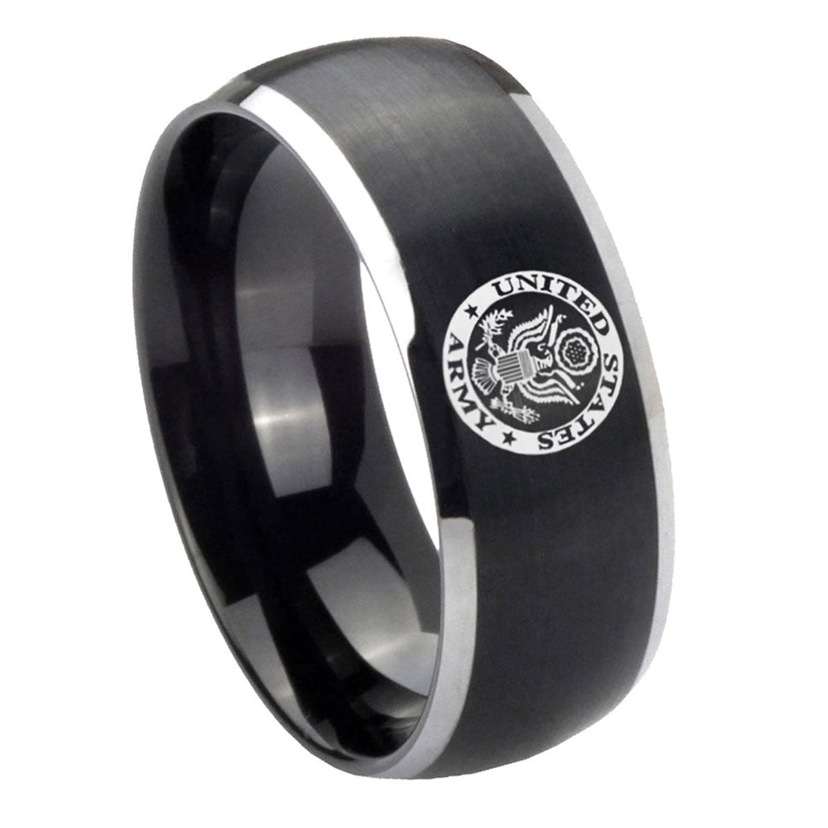 Introuding 5, 8mm U.S. Army Dome Brushed Black 2 Tone Tungsten Custom Mens Ring . Offer in both 5mm and 8mm band width brushed black plated 2 tone finished from size 4 to 14
