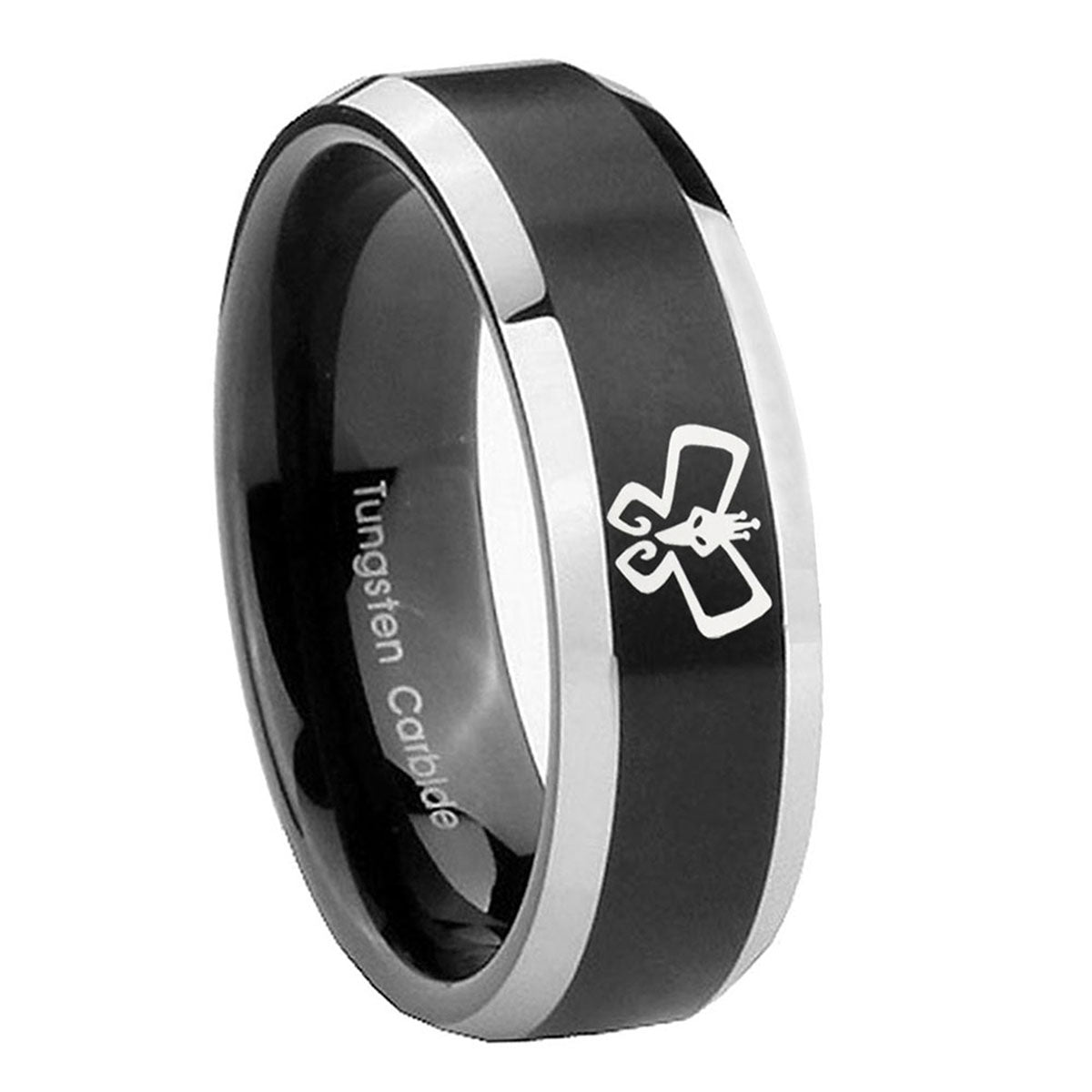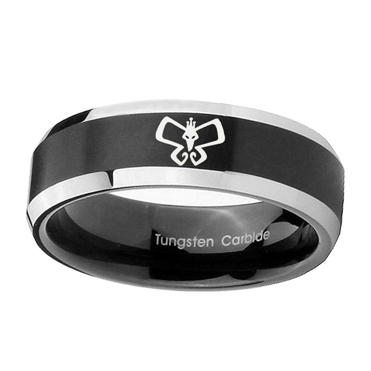 Style the 10mm Monarch Beveled Edges Brush Black 2 Tone Tungsten Carbide Mens Ring. This brushed black and 2-tone tungsten ring with Monarch design is perfect for men.