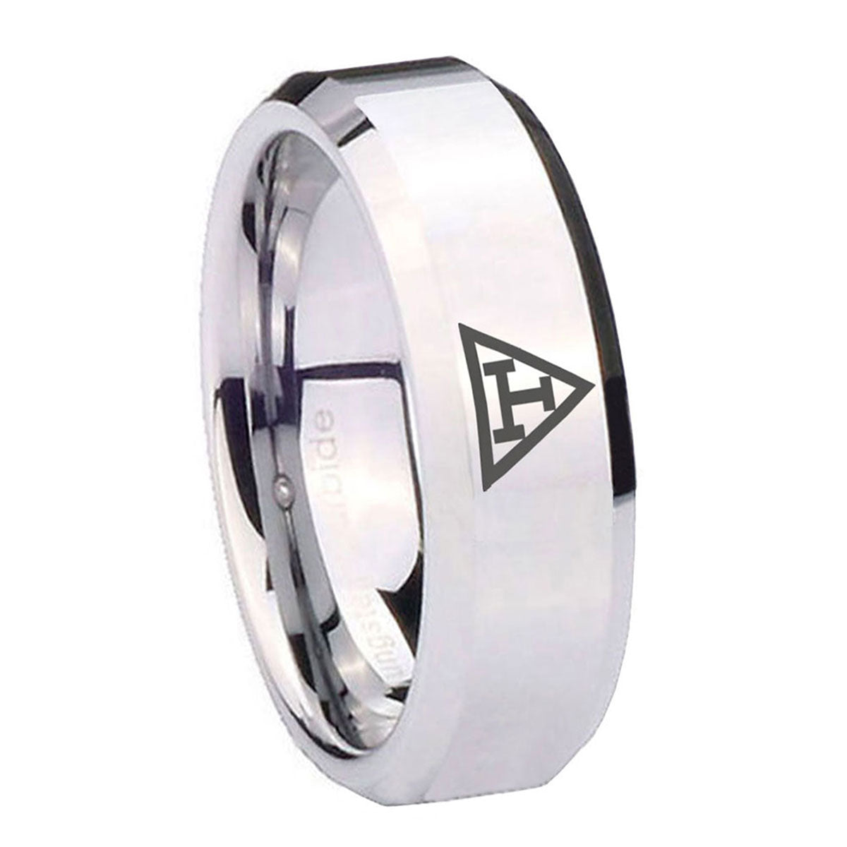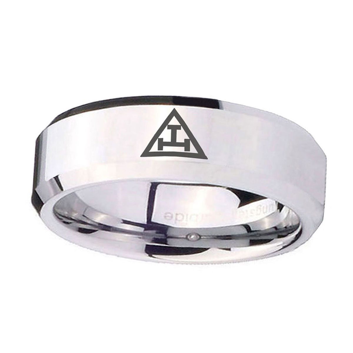 Celebrate with the 10mm Masonic Triple Beveled Edges Silver Tungsten Carbide Wedding Bands Ring. This silver tungsten ring with Masonic Triple design is perfect for weddings.