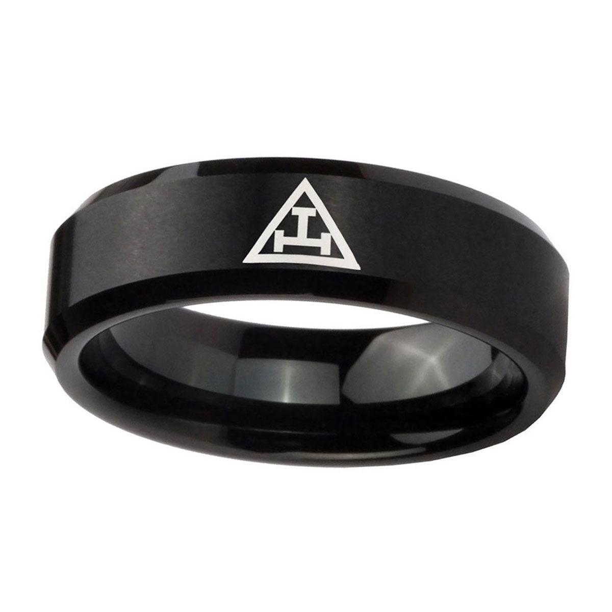 Propose with the 10mm Masonic Triple Beveled Edges Brush Black Tungsten Mens Engagement Ring. This brushed black tungsten ring with Masonic Triple design is ideal for engagements.