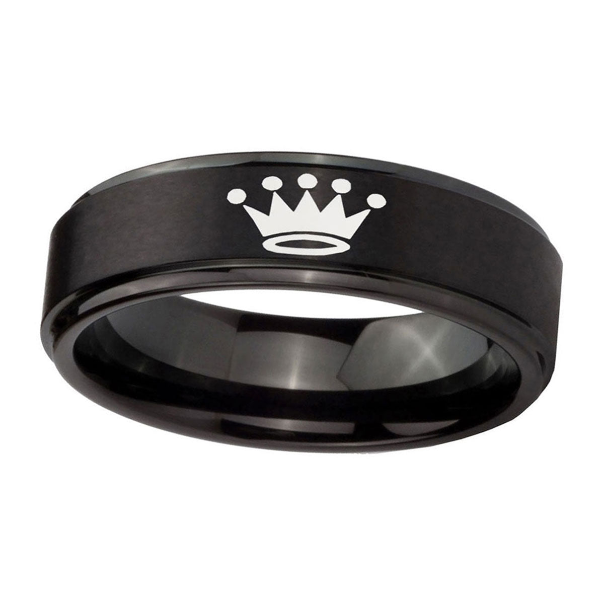 Propose with the 10mm Crown Step Edges Brush Black Tungsten Carbide Wedding Engagement Ring. This brushed black ring with step edges and Crown design is ideal for engagements.
